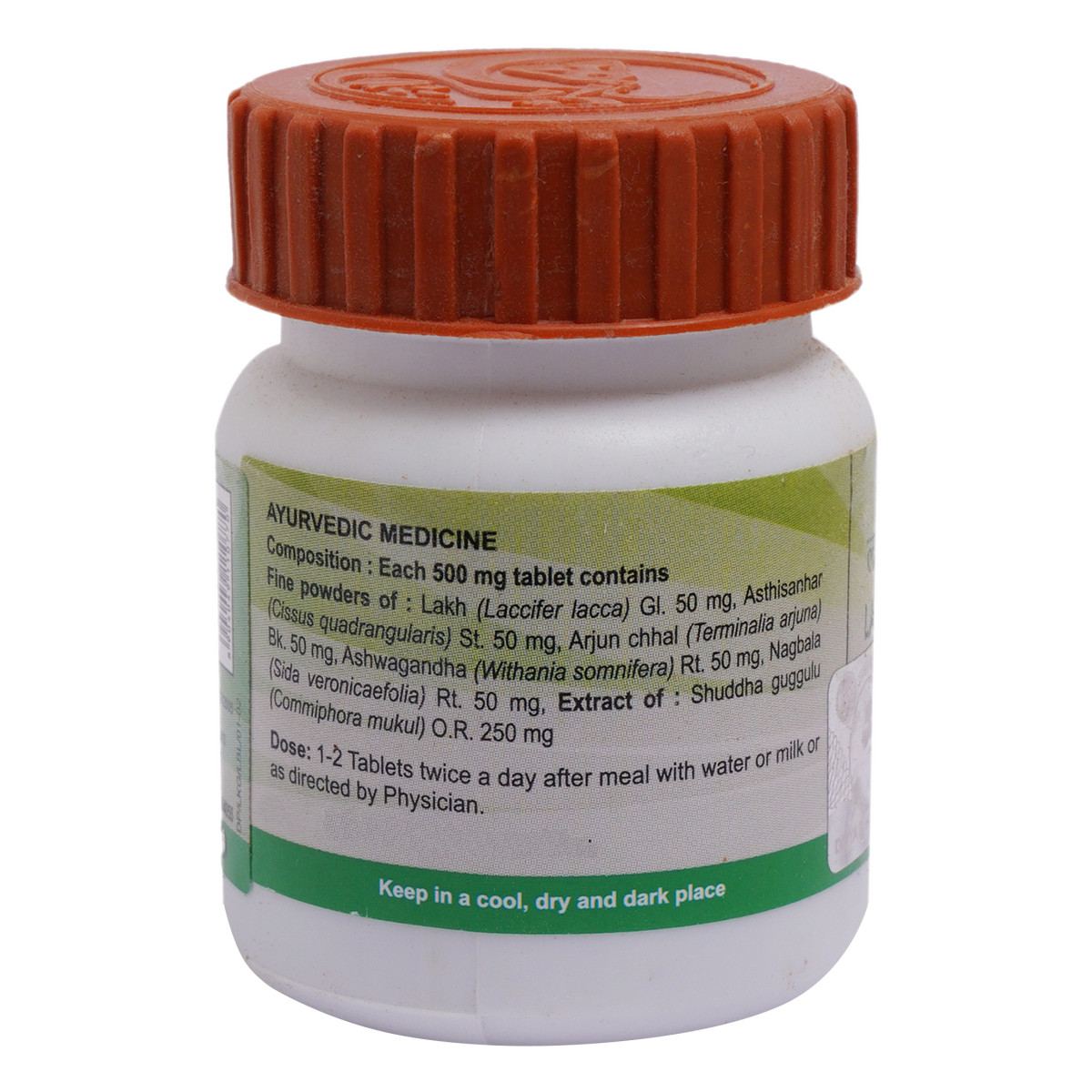 Light to dark brown colour, round biconvex film coated tablet aromatic odour and bitter taste. Shuddha guggulu,Lakh,Asthisanhar,Arjun chaal,Ashwagandha,Nagbala. To be taken under medical supervision. 1-2 Tablets with honey , twice daily or as directed by the physician.