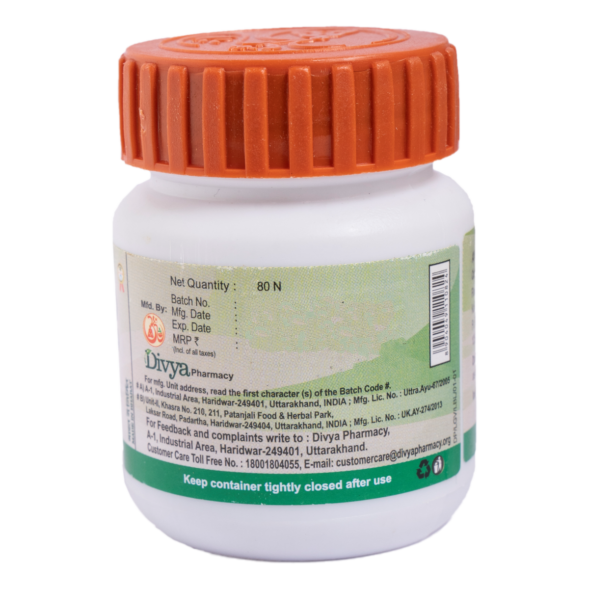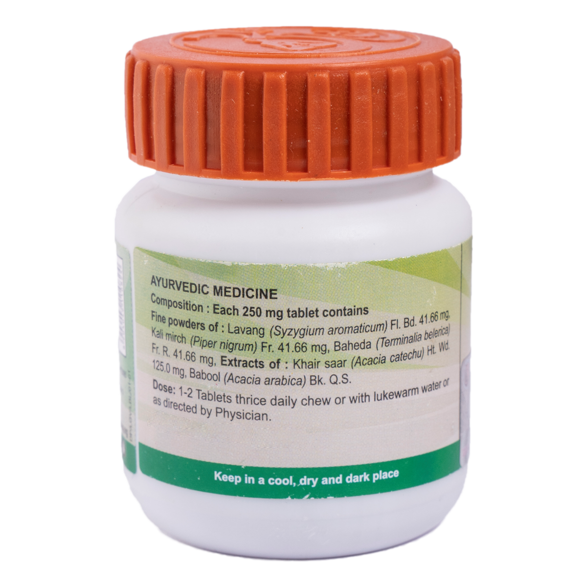 Light to dark brown colour, round biconvex film coated tablet pleasant odour, bitter astringent taste. Laung, Kali Mirch, Baheda, Khair saar, Babool. To be taken under medical supervision. 1-2 tablets thrice daily chew or with lukewarm water or as directed by the physician.