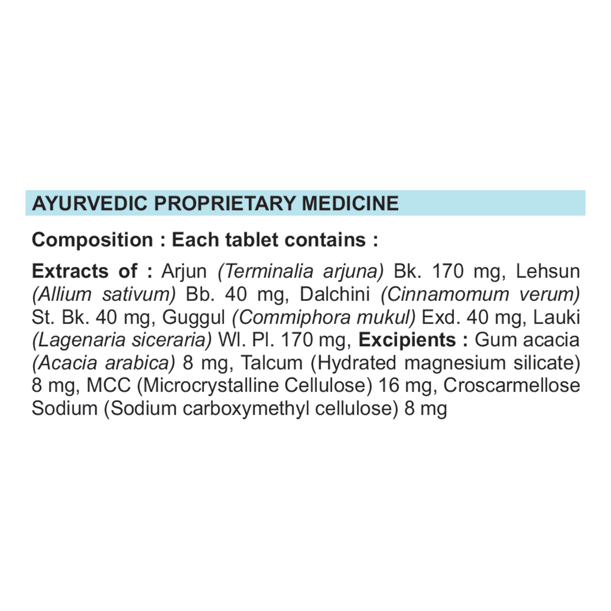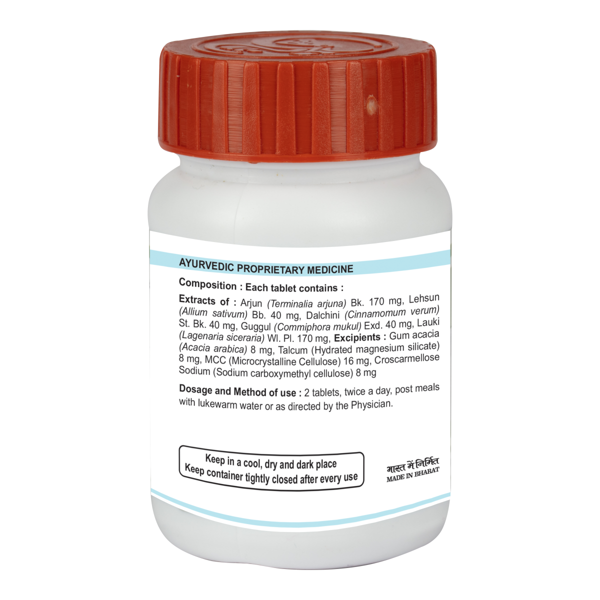 Light to dark brown colour, round biconvex film coated tablet with characteristic odour taste. Arjun, Lehsun, Dalchini, Guggul, Lauki