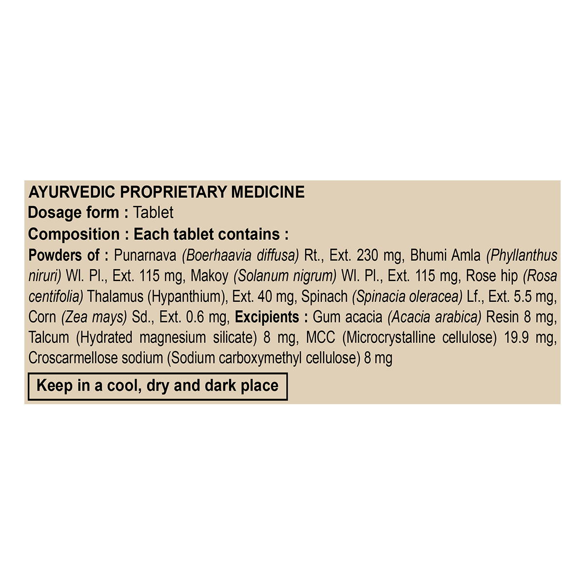 Dark red colour, round biconvex coated tablet with characteristic odour & taste Punarnava, Bhumi Amla, Makoy, Rose hip, Spinach, Corn
