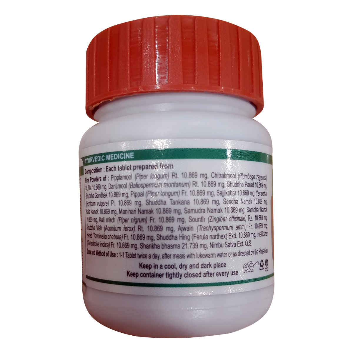 Light to dark grey colour, round biconvex uncoated tablet with characteristic odour & taste. Pipplamool , Chitrakmool, Dantimool, Shuddha Parad, Shuddha Gandhak, Pippal, Sajjikshar , Yavakshar, Shuddha Tankana , Sendha Namak,Kala Namak, Manihari Namak, Samudra Namak, Sambhar Namak, Kali mirch, Sounth, Shuddha Vish, Ajwain, Harad , Shuddha Hing, Imalikshar, Shankha bhasma, Nimbu Satva To Be Taken Under Medical Supervision. 1-1 tablet twice a day, after meals with lukewarm water or as directed by the physician.