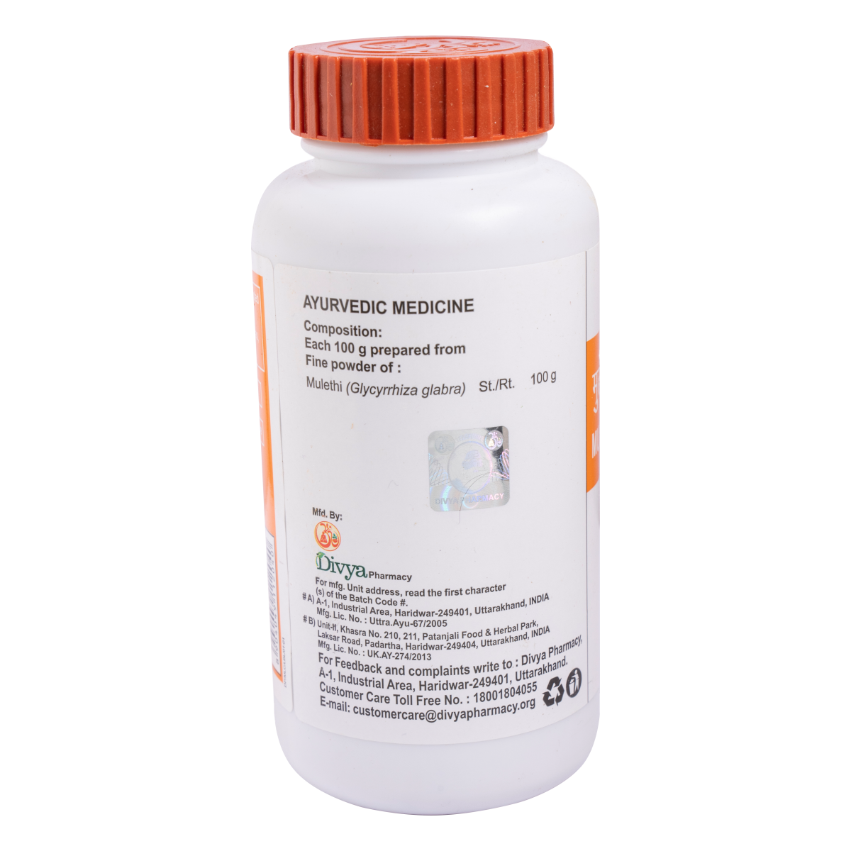 Yellowish brown colour, characteristic odour & sweet taste, fine powder. To Be Taken Under Medical Supervision. Take 1-4 g powder of Divya Mulethi Churna twice or thrice daily empty stomach with lukewarm water or milk or as directed by the Physician.