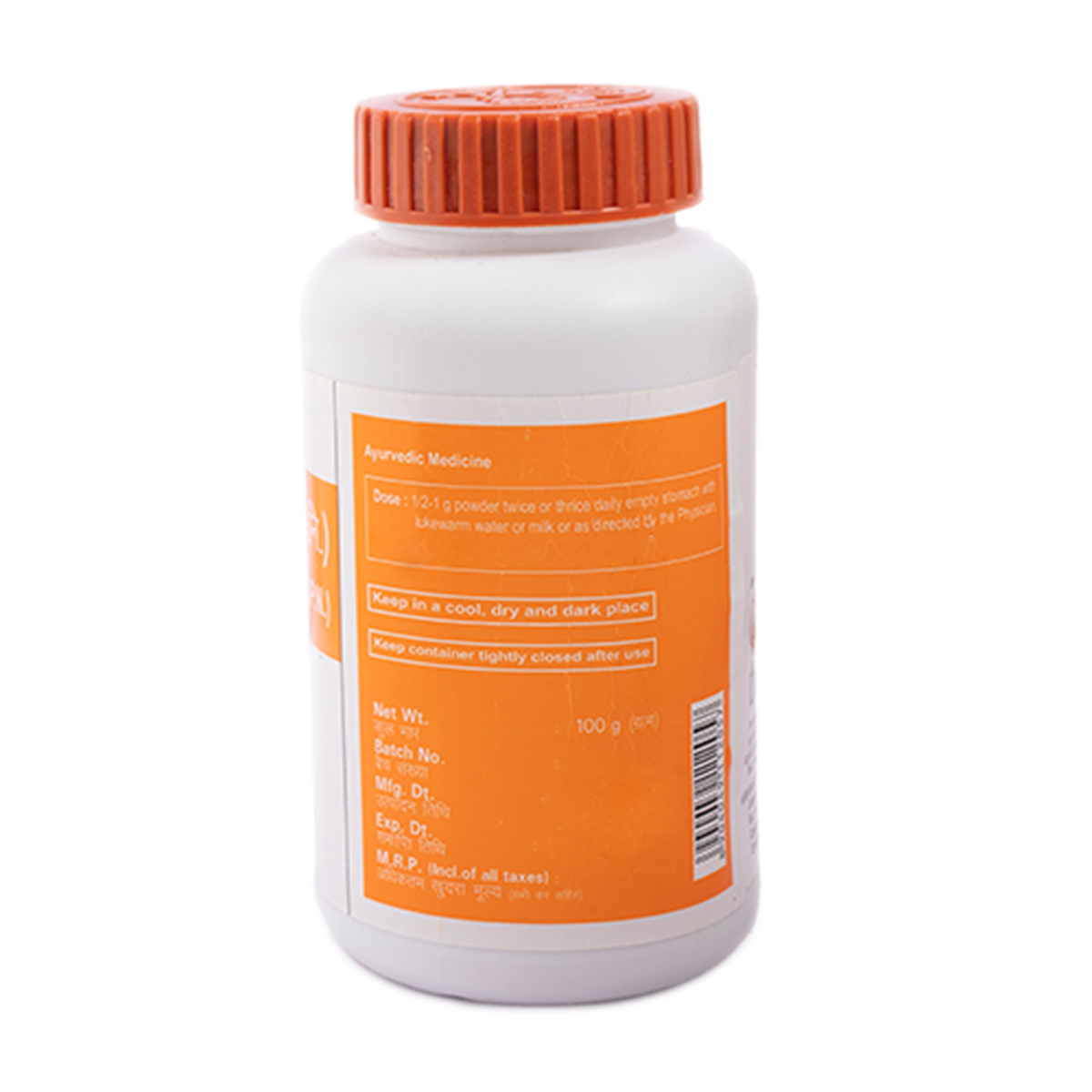 Brown colour, characteristic odour & bitter taste, fine powder. To be taken under medical supervision. 1/2 -1 g or as directed by the physician.