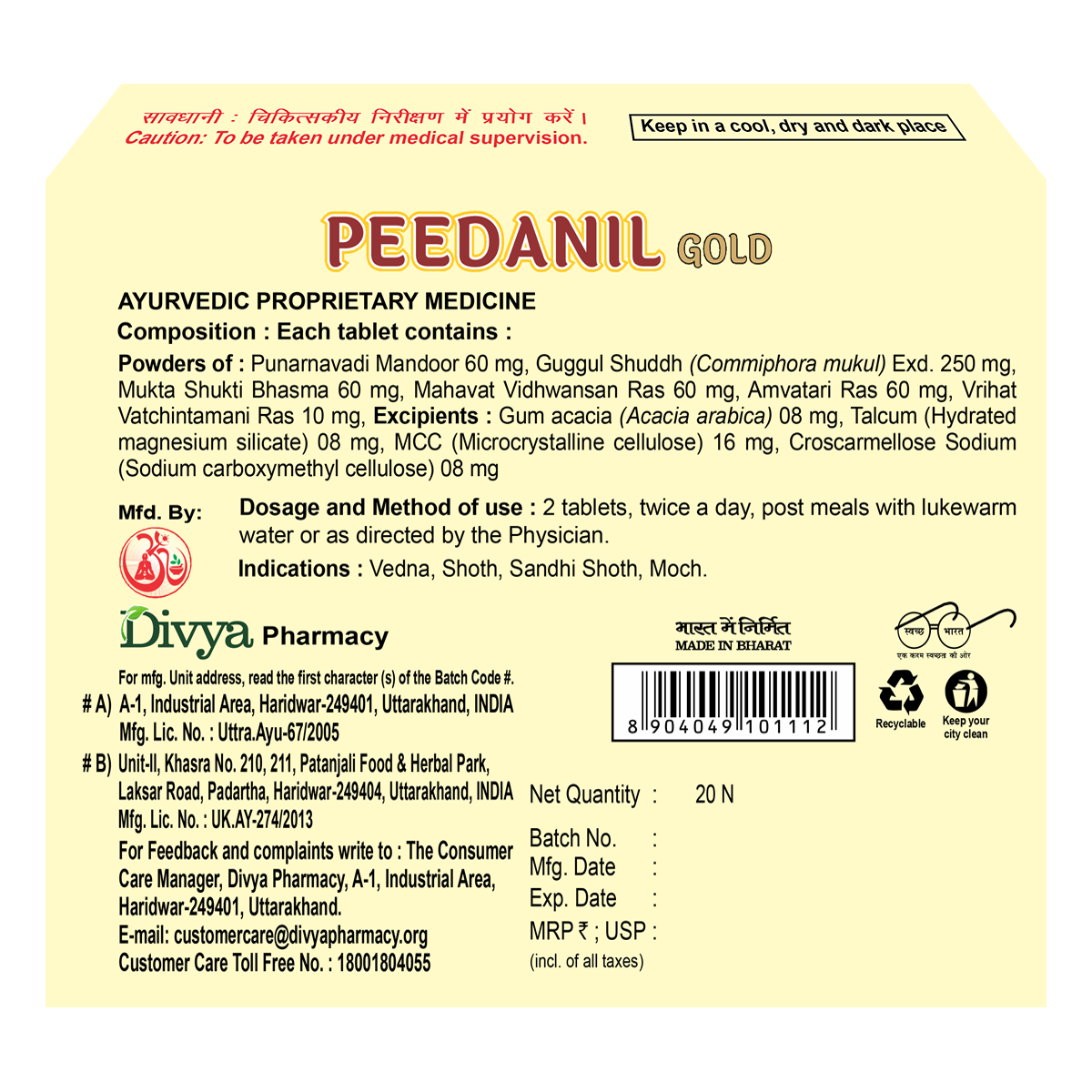 Light to dark gold colour, round biconvex film coated tablet with characteristic odour & taste. Punarnavadi Mandoor, Guggul Shuddh , Mukta Shukti Bhasma, Mahavat Vidhvansan Ras , Aamvatari Ras, Brihat Vatchintamani Ras