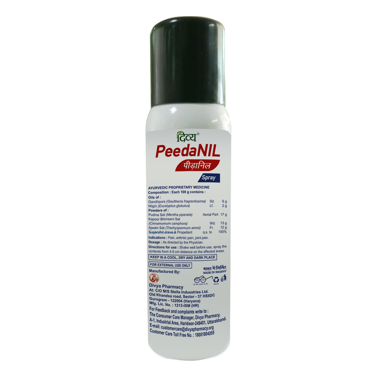 Colourless to very pale yellow oily liquid. Useful in pain relief. Peedanil Spray is very easy to use. Gandhpura, Nilgiri, Pudina sat, Kapoor, bhimseni sat, Ajwain sat, Sugandhit dravya To be taken under medical supervision.