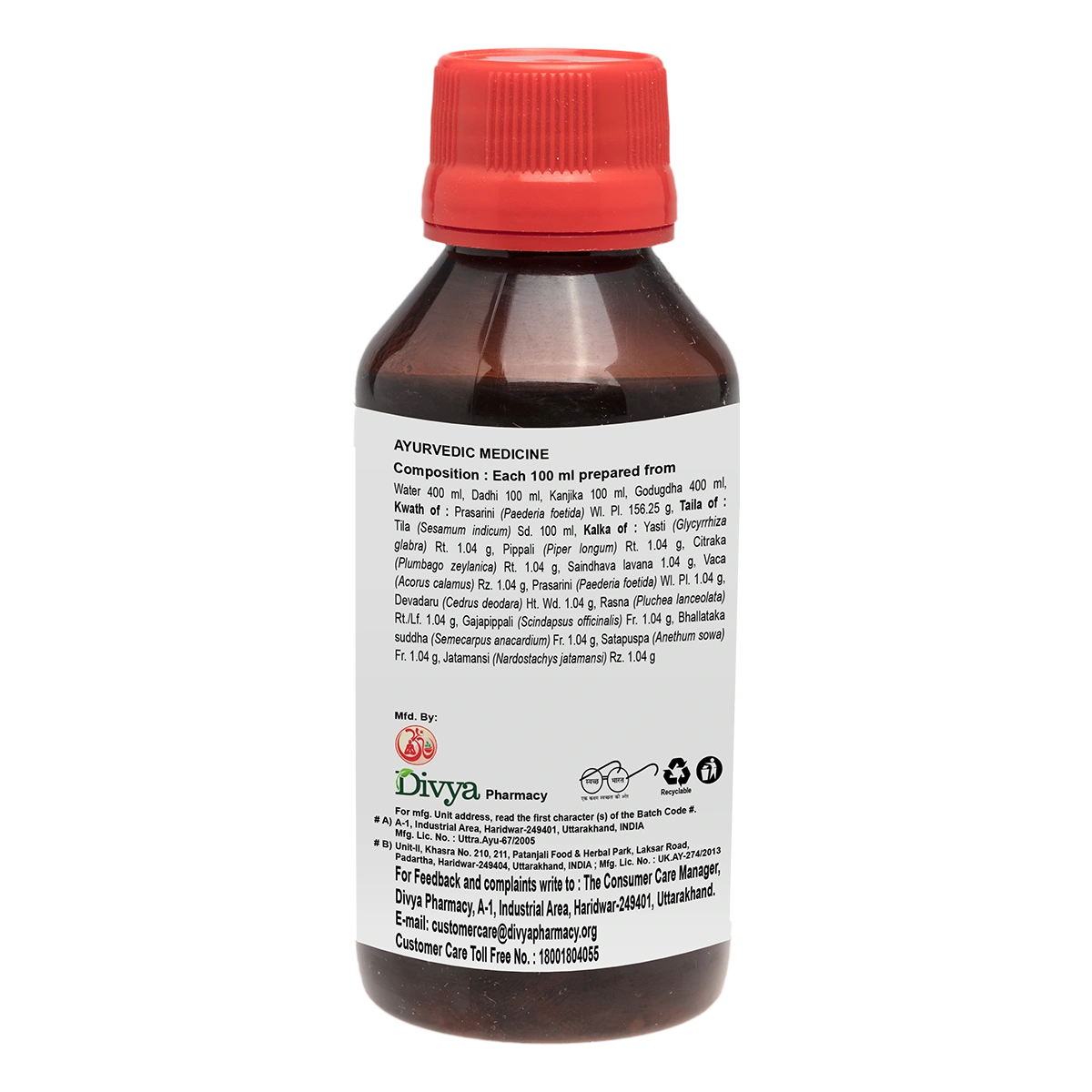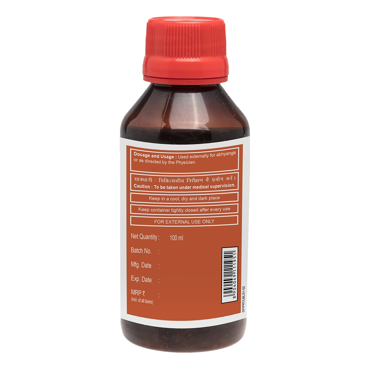 Medicated oil, yellowish brown in colour with unpleasant odour. Prasarini ,Tila Taila, Kanjika, Madhuka, Yasti, Pippali,Chitraka, Saindhava Namak, Prasarini , Devadaru, Rasna, Gajapippali ,Bhallataka Shuddha,Satapushpa, JataMamsi To be taken under medical supervision. Used externally for abhyanga or ass directed by the physician.