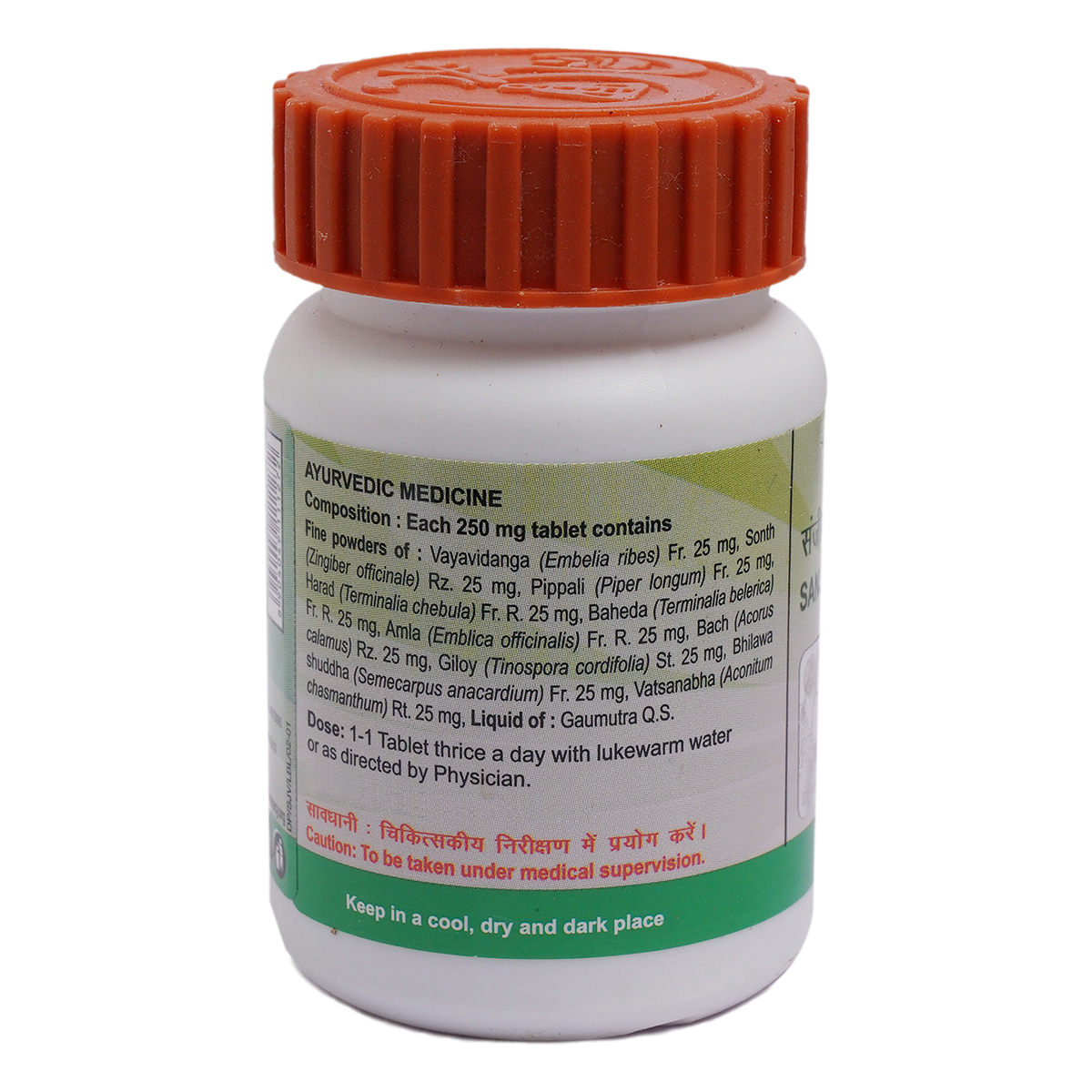 Light to dark brown colour, round biconvex film coated tablet, pleasant odour & acrid taste. Vayavidanga ,Sonth ,Pippali ,Harad ,Baheda ,Amla ,Vach ,Giloy ,Bhilawa Shudhha,Vatsanabha Shudhha To be taken under medical supervision. 1-2 Tablets with lukewarm water thrice daily or as directed by the physician.