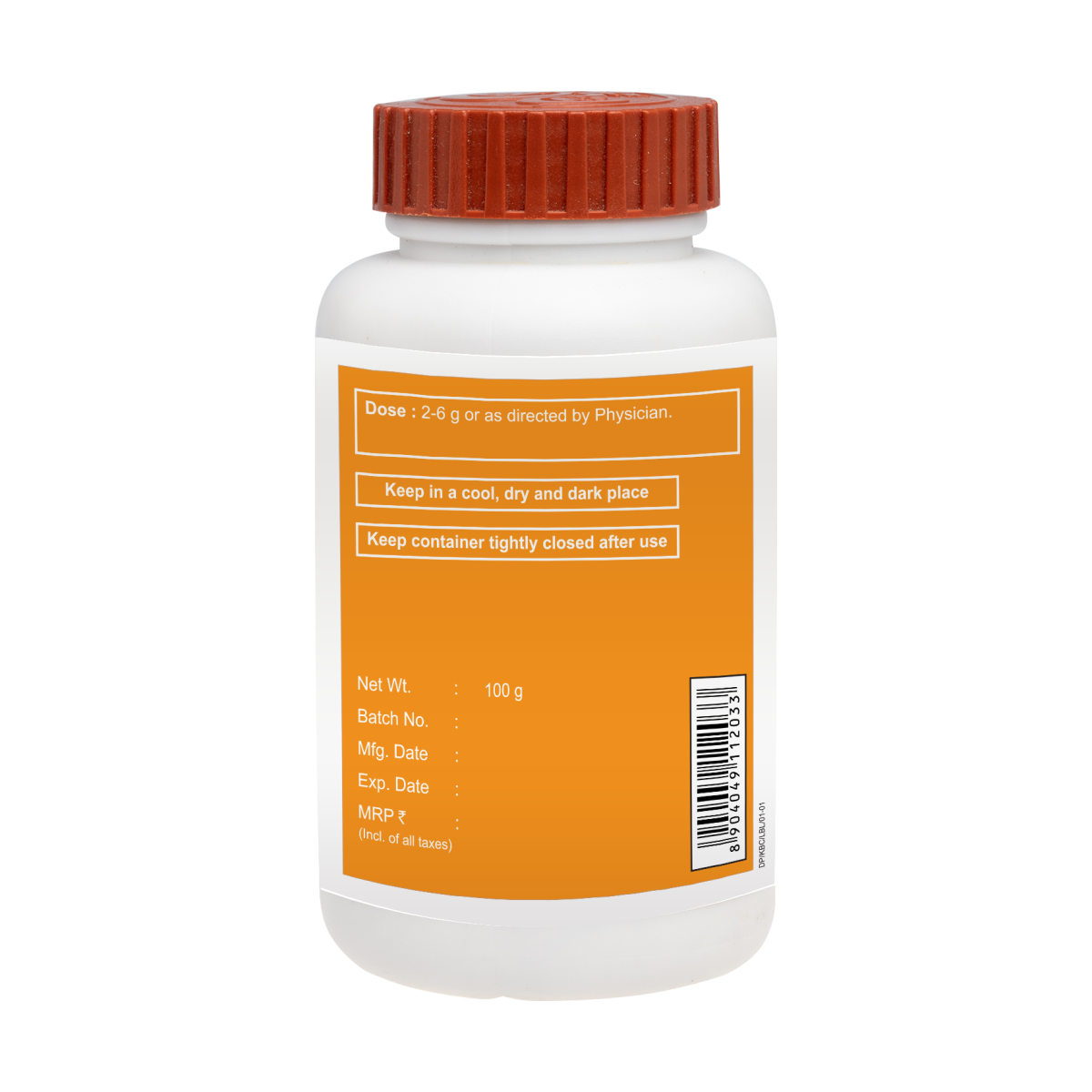 Creamish white colour, characteristic odour bitter taste, fine powder. To be taken under medical supervision. 2-6 g with milk or honey as directed by the physician or directed by the physician.