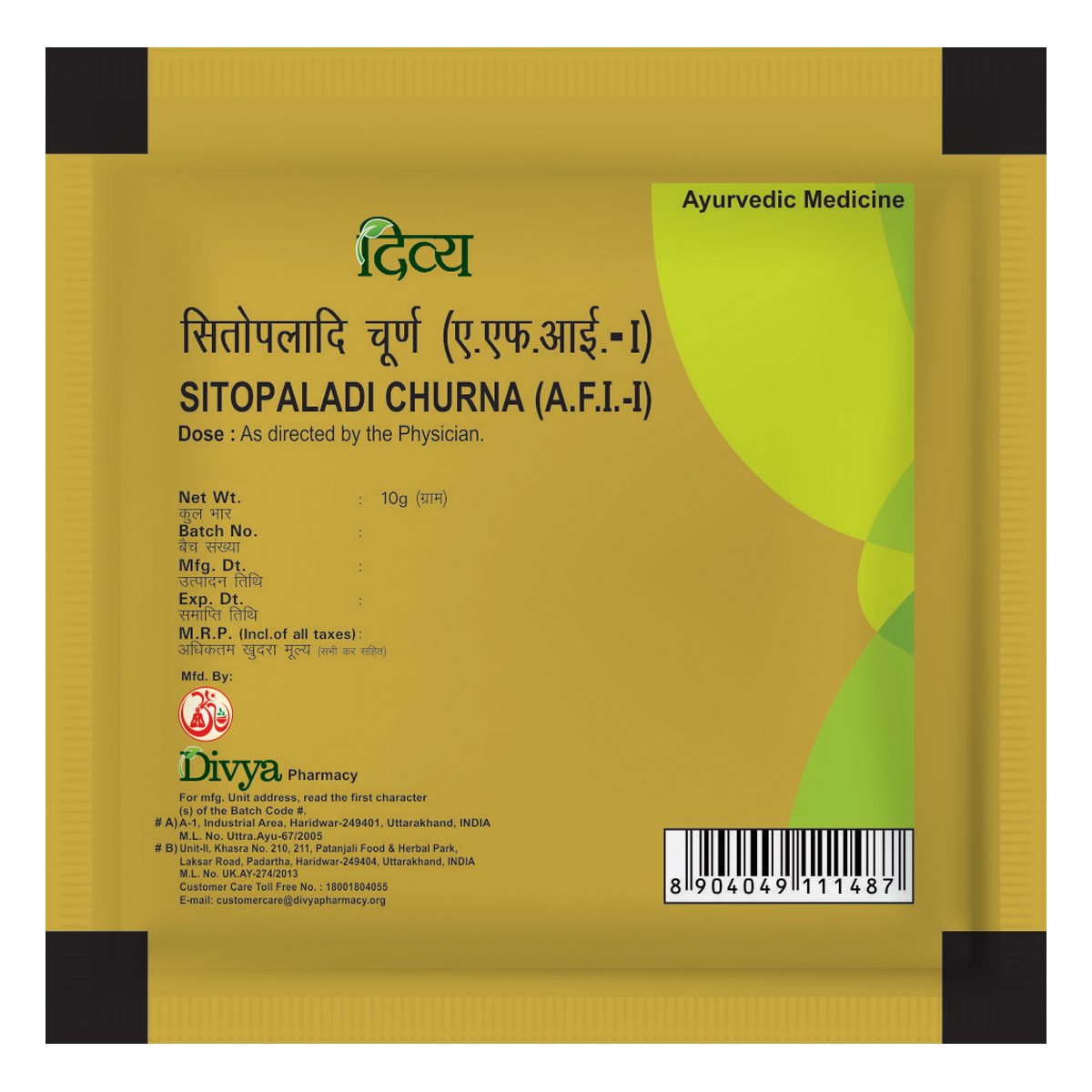 Cream colour, fragrant odour, sweet & pungent taste, fine powder. Sitopala, Vankshalochana, Pippali,Ela,Tvak. To be taken under medical supervision. 1-3 g with honey and ghee or as directed by physician.