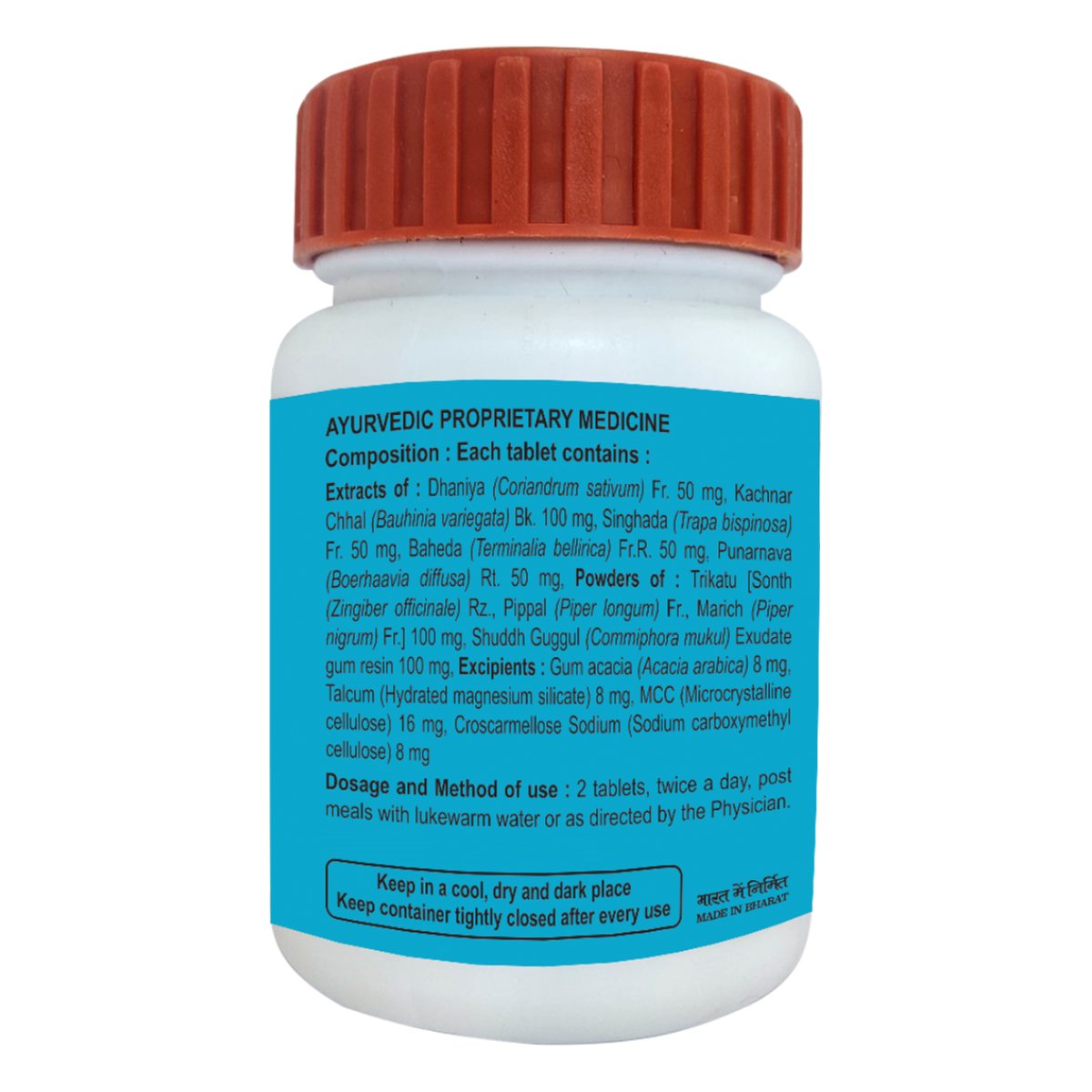 Light to dark brown colour, round biconvex film coated tablet with characteristic odour & taste Dhaniya ,Kachnar Chhal ,Singhada ,Baheda ,Punarnava ,Trikatu, Shuddh Guggul