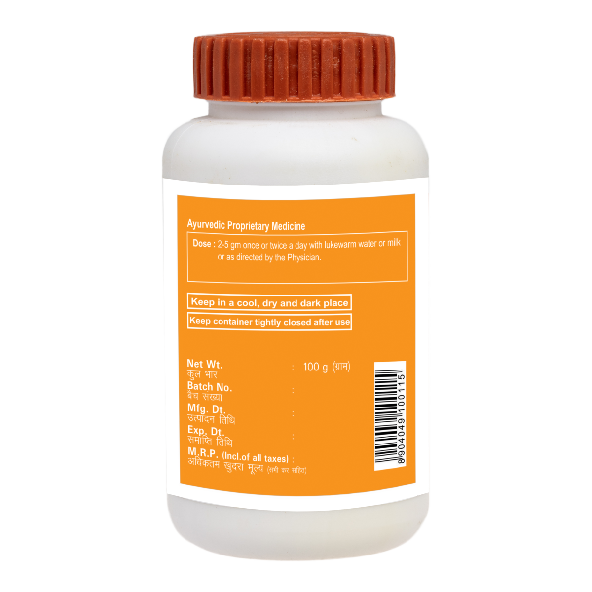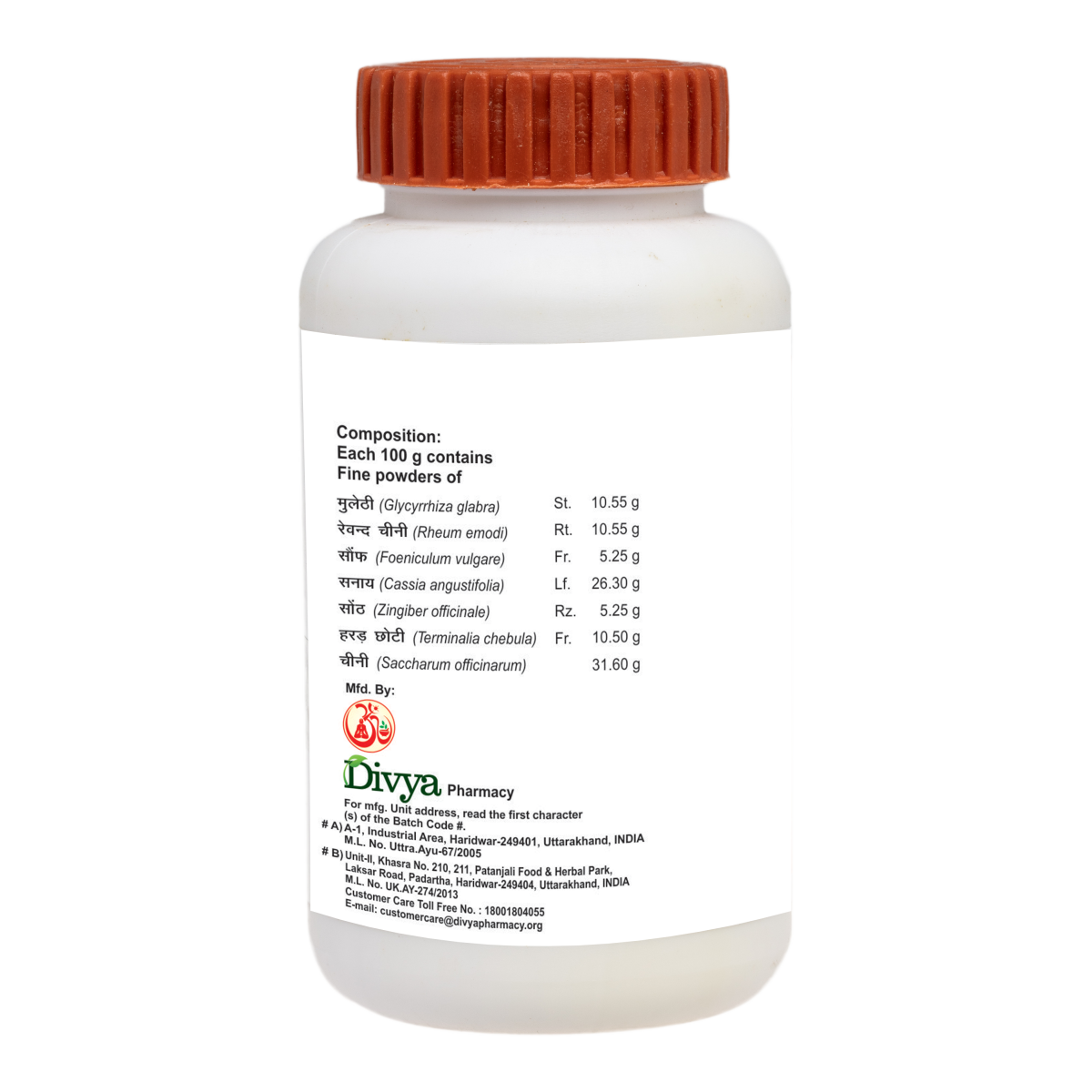 Light to dark greenish yellow colour, characteristic odour & sweet taste, fine powder Mulethi, Revand Chini, Sounf, Sanay, Sonth, Chhoti Harad, Chini. To be taken under medical supervision. Consume Divya Udarkalp Churna as directed by the physician.