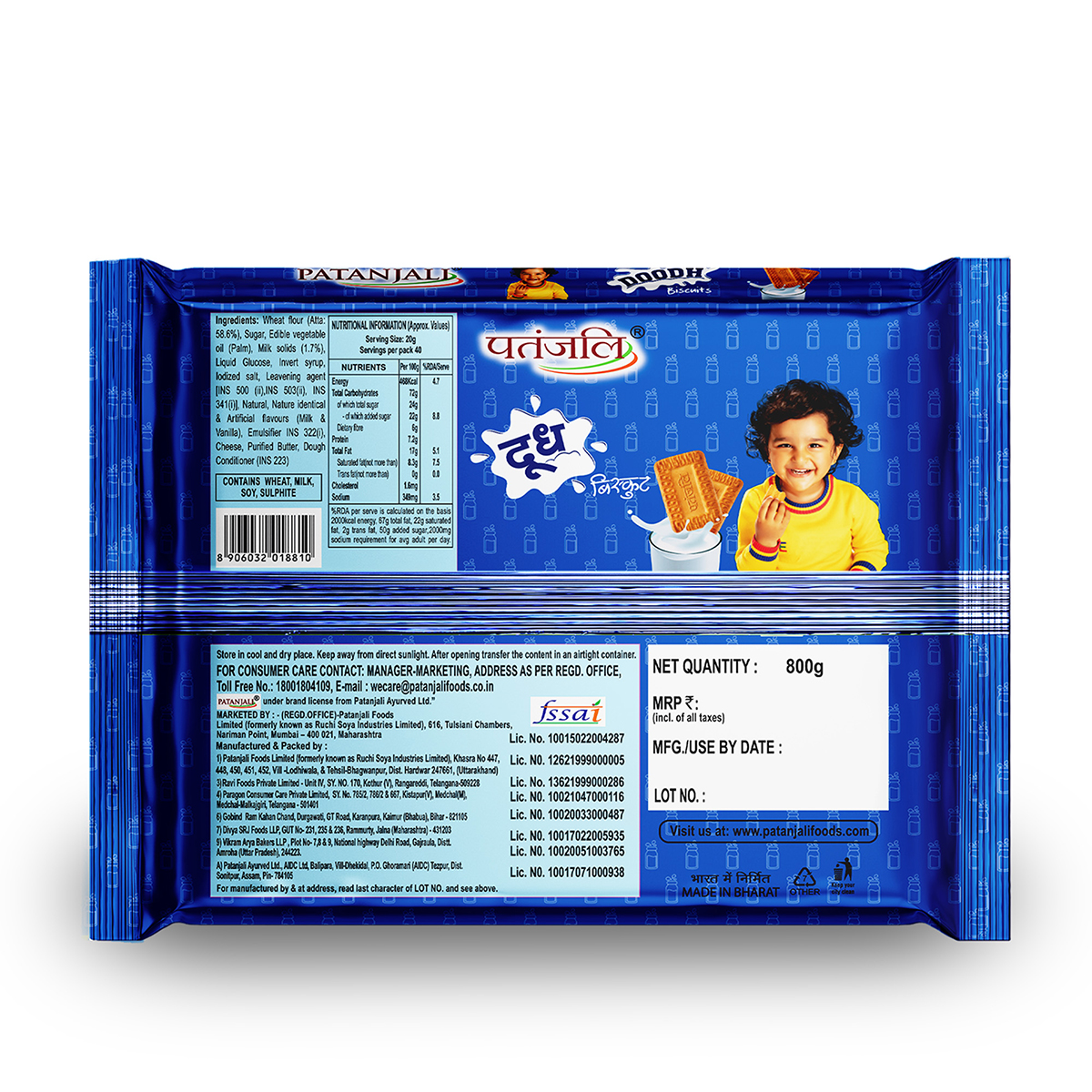 Patanjali's doodh biscuits are atta biscuits made using only whole wheat flour, with the added benefit of fiber content. The ingredients of Patanjali doodh biscuits consist of whole wheat flour (atta), sugar, and milk solids. Known for the enrichment of milk, these biscuits offer a delicately balanced sweetness, making them an ideal companion to morning tea or coffee. The expertise in the baking process ensures these biscuits have a light, crispy texture.