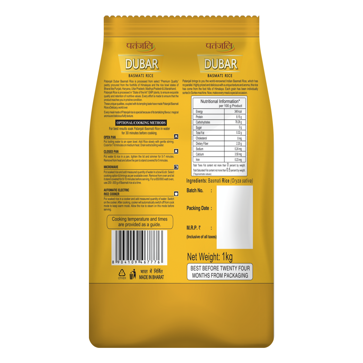 Basmati Rice is a premium long-grain rice known for its distinct aroma and delicate flavor. Dubar rice are fragmented rice grains that exceed the length of 75% of the full-length rice. Patanjali Dubar Basmati Rice (Pusa Basmati 1121) variety is highly sought after for its superior quality, slender grains, and fluffy texture. PB 1121 is a long, slender, and fragrant Basmati variety of Rice. When cooked, the rice does not turn sticky, and possesses minimum breadth-wise expansion. Cooked rice is fluffy white with pleasant aroma and very tasty to eat.