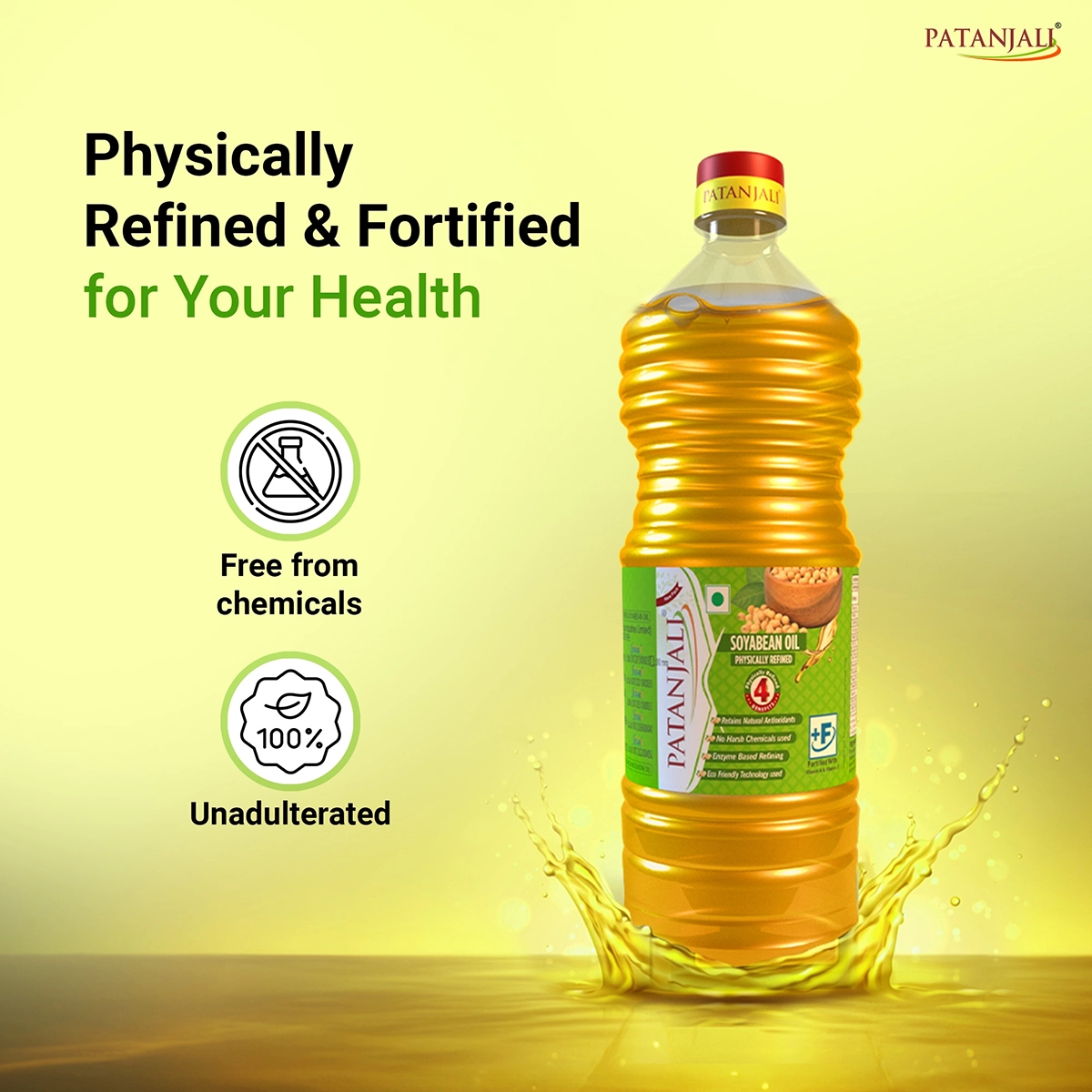 Soyabean oil is a clear, light-colored vegetable oil that is derived from the seeds of the soybean plant. It has a neutral flavor and is widely used in cooking. Patanjali fortified soyabean oil is completely natural and pure soyabean oil. It is unadulterated and free from minerals and chemicals.