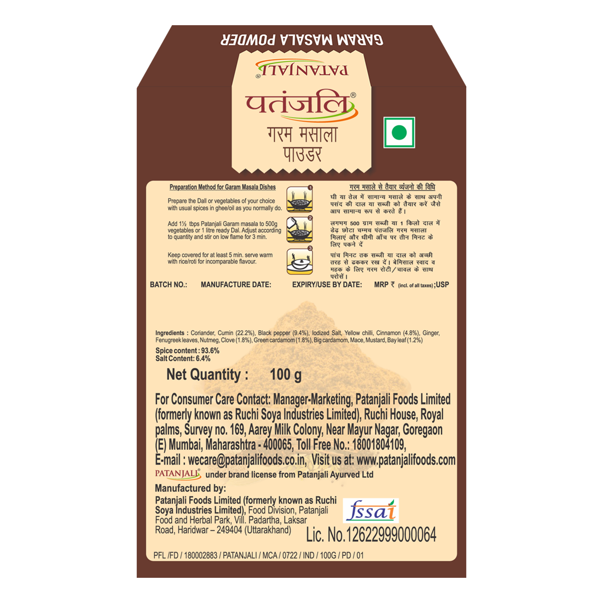 Garam Masala is a meticulously crafted blend of ground spices. Patanjali brings you the goodness of India's very finest spices, rich in aroma and taste, freshly packed for your cooking pleasure. Patanjali garam masala powder is obtained by mixing several grinded spices.