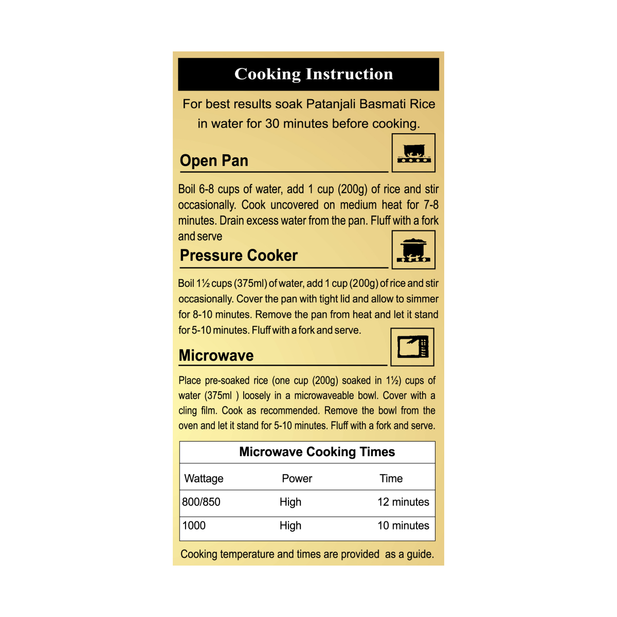 Basmati Rice is a premium long-grain rice known for its distinct aroma and delicate flavor. Patanjali Gold Basmati Rice (Pusa Basmati 1121) variety is highly sought after for its superior quality, slender grains, and fluffy texture. PB 1121 is a long, slender, and fragrant basmati variety of rice. When cooked, the rice does not turn sticky and possesses minimum breadth-wise expansion. Cooked rice is fluffy white with a pleasant aroma and is very tasty to eat.