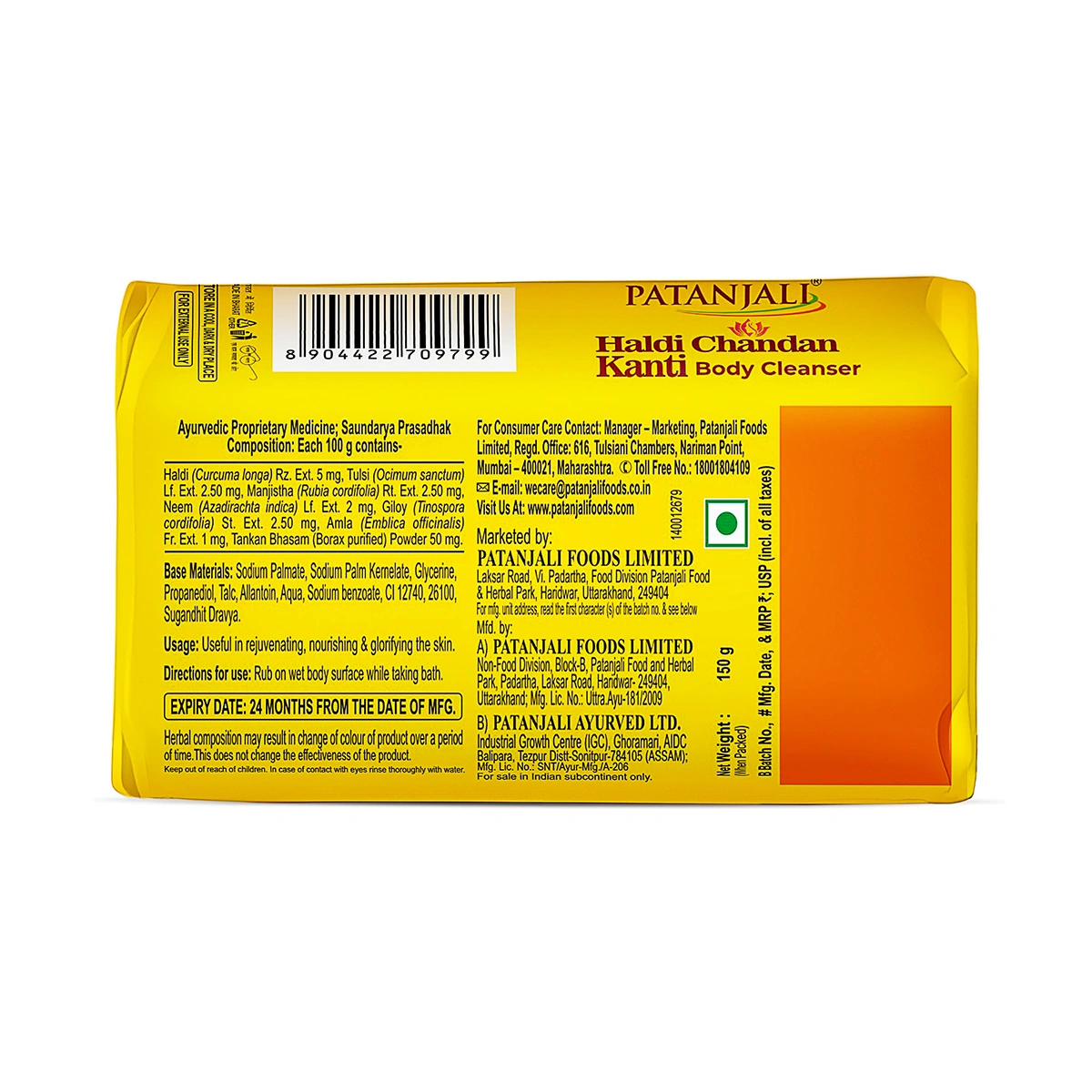 Patanjali Ayurveda Haldi Chandan Kanti Body Cleanser Soap is an effective body cleanser infused with the goodness of turmeric and sandalwood. It is enriched with the natural properties of turmeric, known for its anti-inflammatory and antioxidant benefits, and sandalwood, renowned for its soothing and calming properties. It deeply cleanses the skin, removing impurities and leaving it feeling refreshed and revitalised. Its creamy lather nourishes and moisturises the skin, leaving it soft, smooth, and supple. Its antiseptic and moisturising action protects from germs and helps provide relief from dryness of skin.