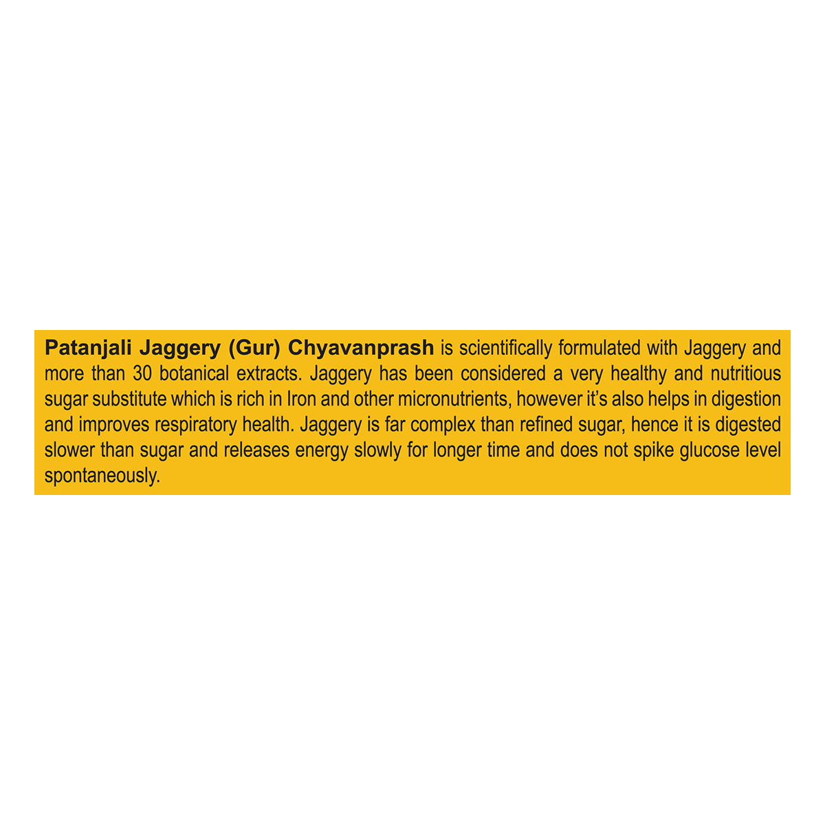 Patanjali jaggery (gur) chyavanprash is scientifically formulated with jaggery and more than 30 botanical extracts. Jaggery has been considered a very healthy and nutrious sugar substitute which is rich in iron and other micro nutrients.