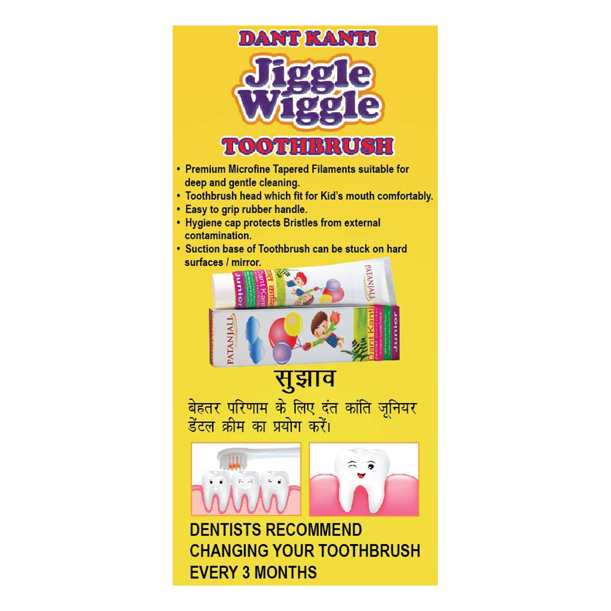 Patanjali dant kanti brings jiggle wiggle toothbrush for your kids. It's premium microfine tapered filaments suitable for deep and gentle cleaning. Toothbrush head which fit for kid's mouth comfortably. It's hygiene cap protects bristles from external contamination.