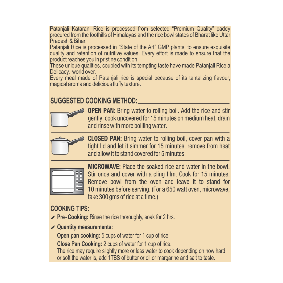 Katarani Rice, a distinctive aromatic short-grain rice cultivated in India's Bihar state, offers a unique taste. Patanjali Katarani Rice is a premium-quality Katarani rice that boasts a well-balanced combination of carbohydrates and fiber, along with essential vitamins and minerals. Patanjali Katarani Rice is characterized by its delightful aroma, local flavor, and superior cooking properties.
