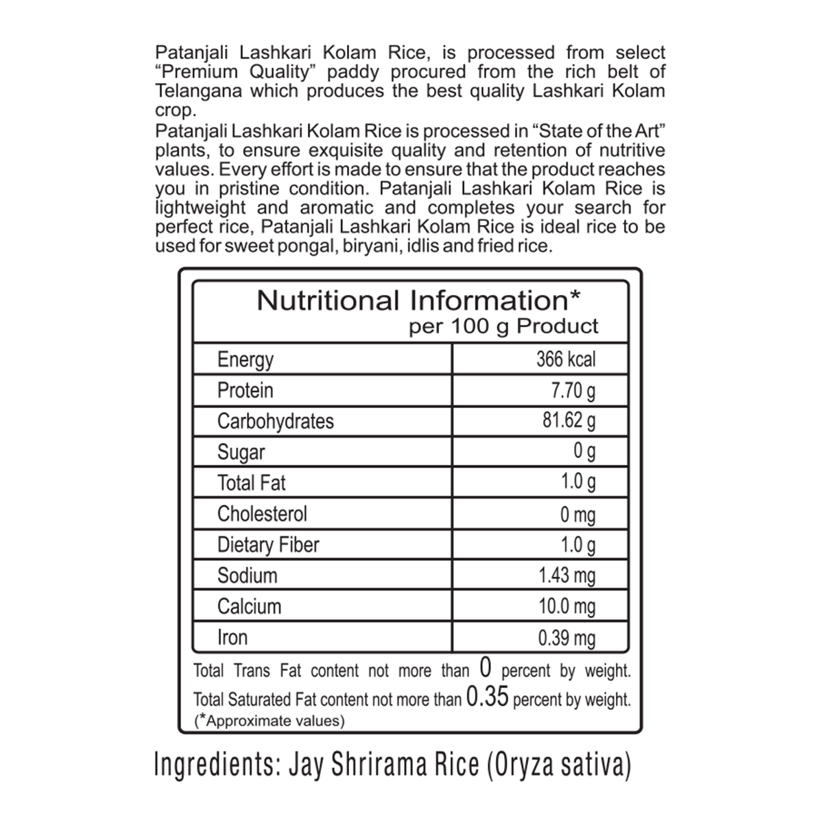 Patanjali Lashkari Kolam Rice, is processed from select "Premium Quality" paddy procured from the rich belt of Telangana which produces the best quality Lashkari Kolam crop.