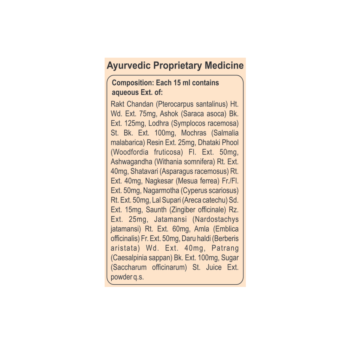 Dark brown colour viscous liquid with orange flavour and bitter in taste.Rakt Chandan To be taken under medical supervision. Take as directed by the physician.