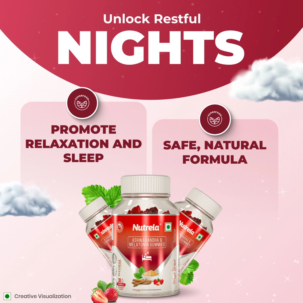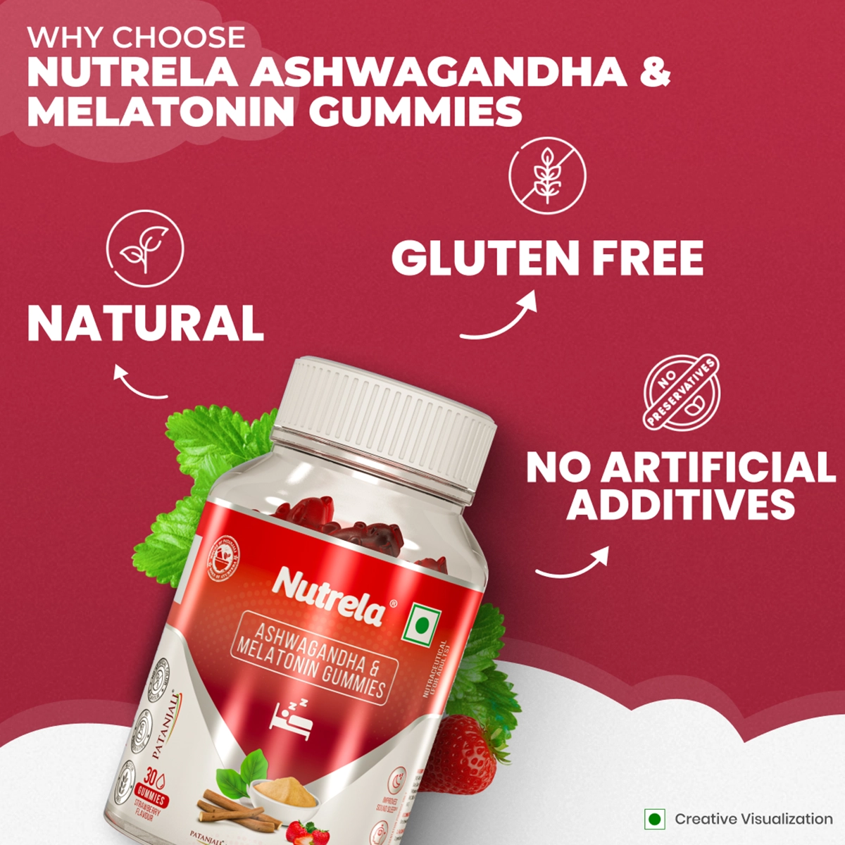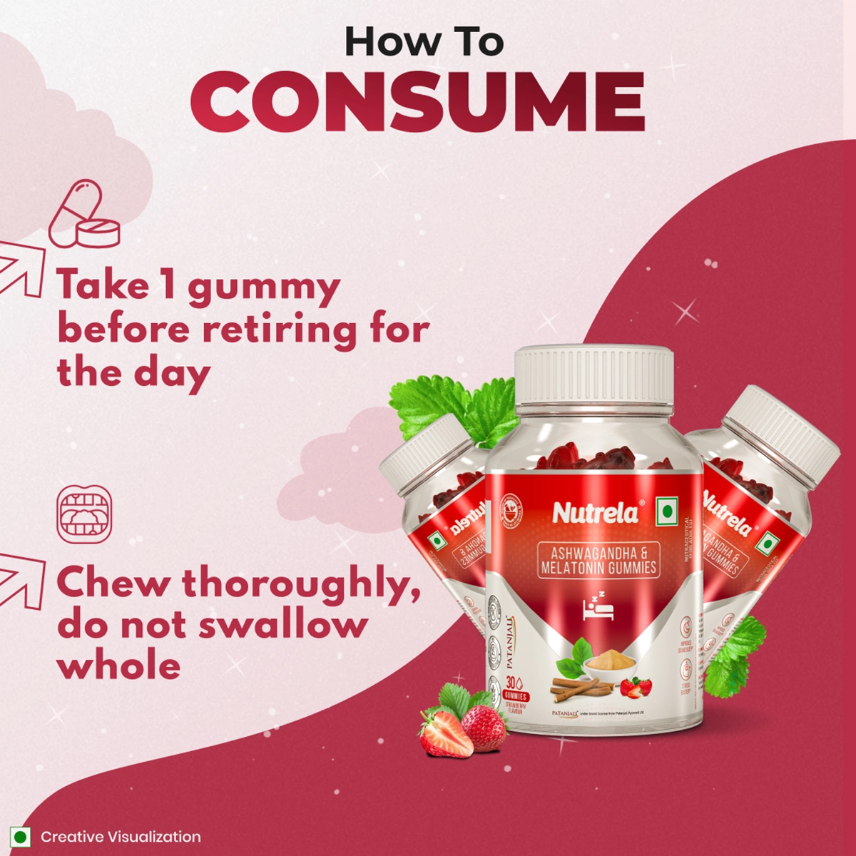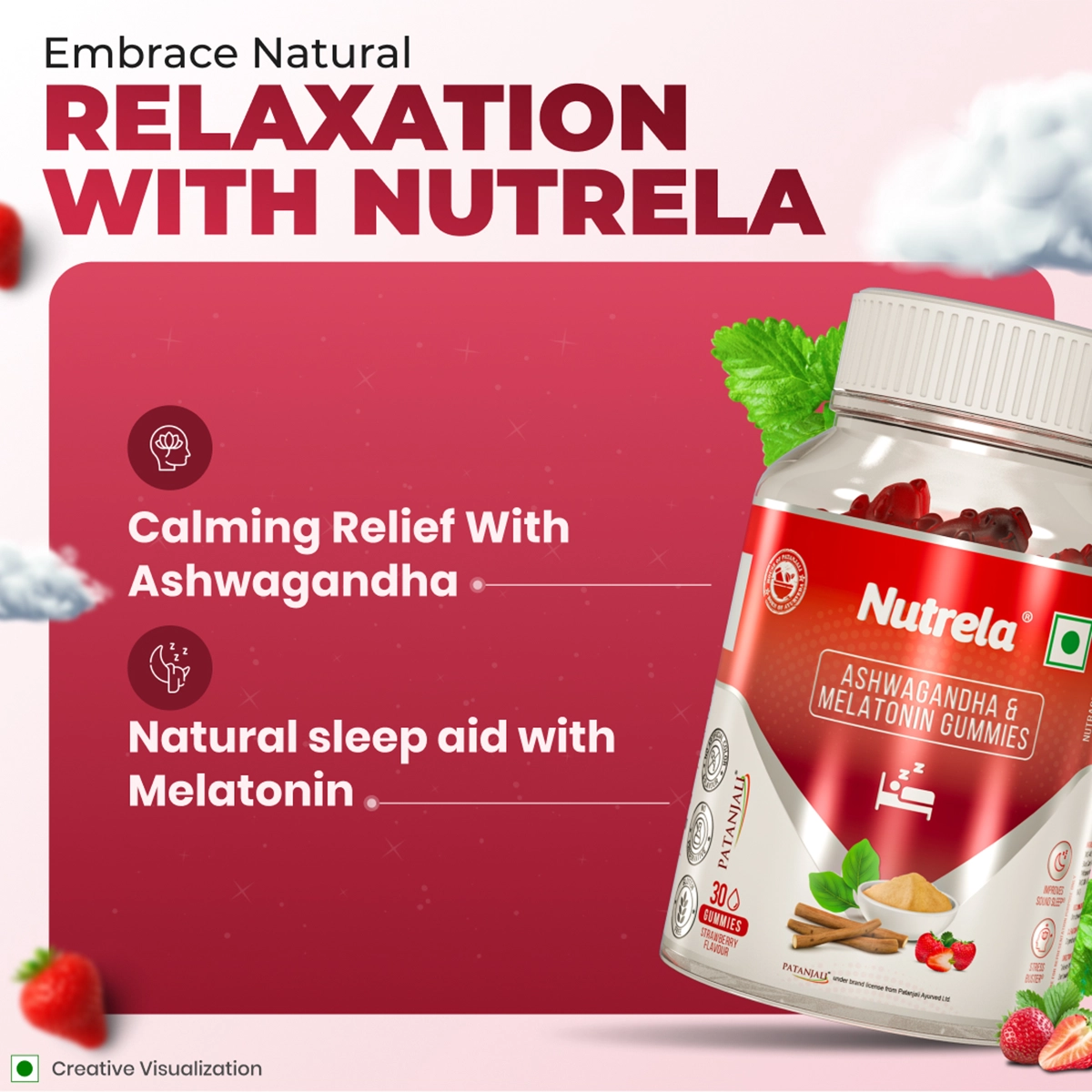 Find tranquility and rest with Patanjali Nutrela Ashwagandha & Melatonin Gummies. Perfect for those looking to relax and improve sleep naturally, these gummies combine the benefits of Ashwagandha for calming relief and Melatonin for regulating sleep. Ideal for adults seeking a chemical-free solution to unwind and sleep better.