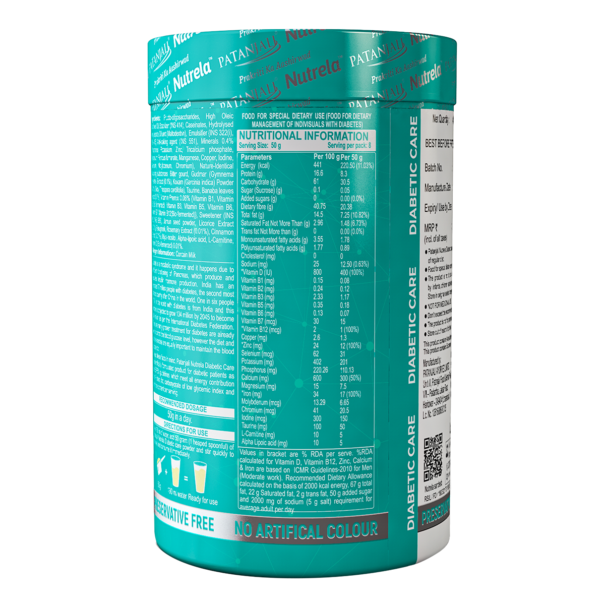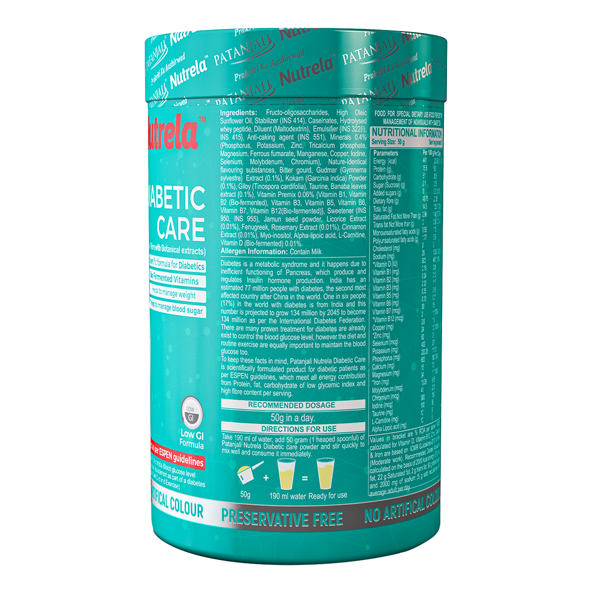 Patanjali Nutrela Diabetic Care Powder is scientifically designed low Glycemic Index (GI) dietary supplement, which is a unique blend of high fibre, high protein,11 botanical extracts & 20 micronutrients which act synergistically and help in regulation of healthy blood glucose level.
