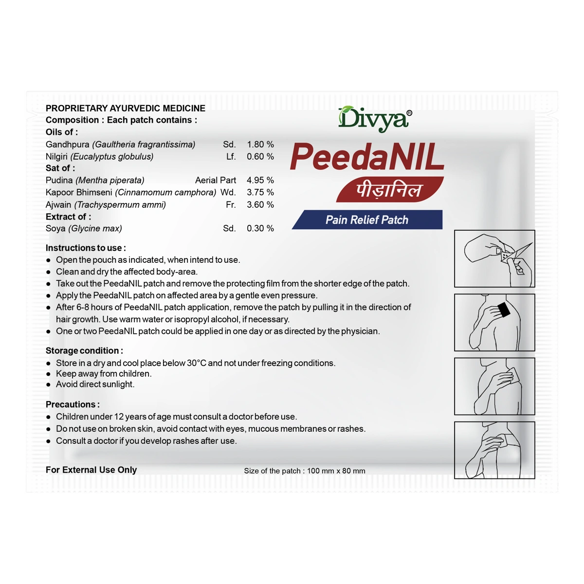 Peedanil Pain Relief Patch Clean and dry the affected body-area. Take out the peedanil patch and remove the protecting film from the shorter edge of the patch. Apply the peedanil patch on affected area by a gentle even pressure. After 6-8 hours of peedanil patch application, remove the patch by pulling it in the direction of Hair growth. Use warm water or isopropyl alcohol, if necessary. One or two peedanil patch could be applied in one day or as directed by the physician.