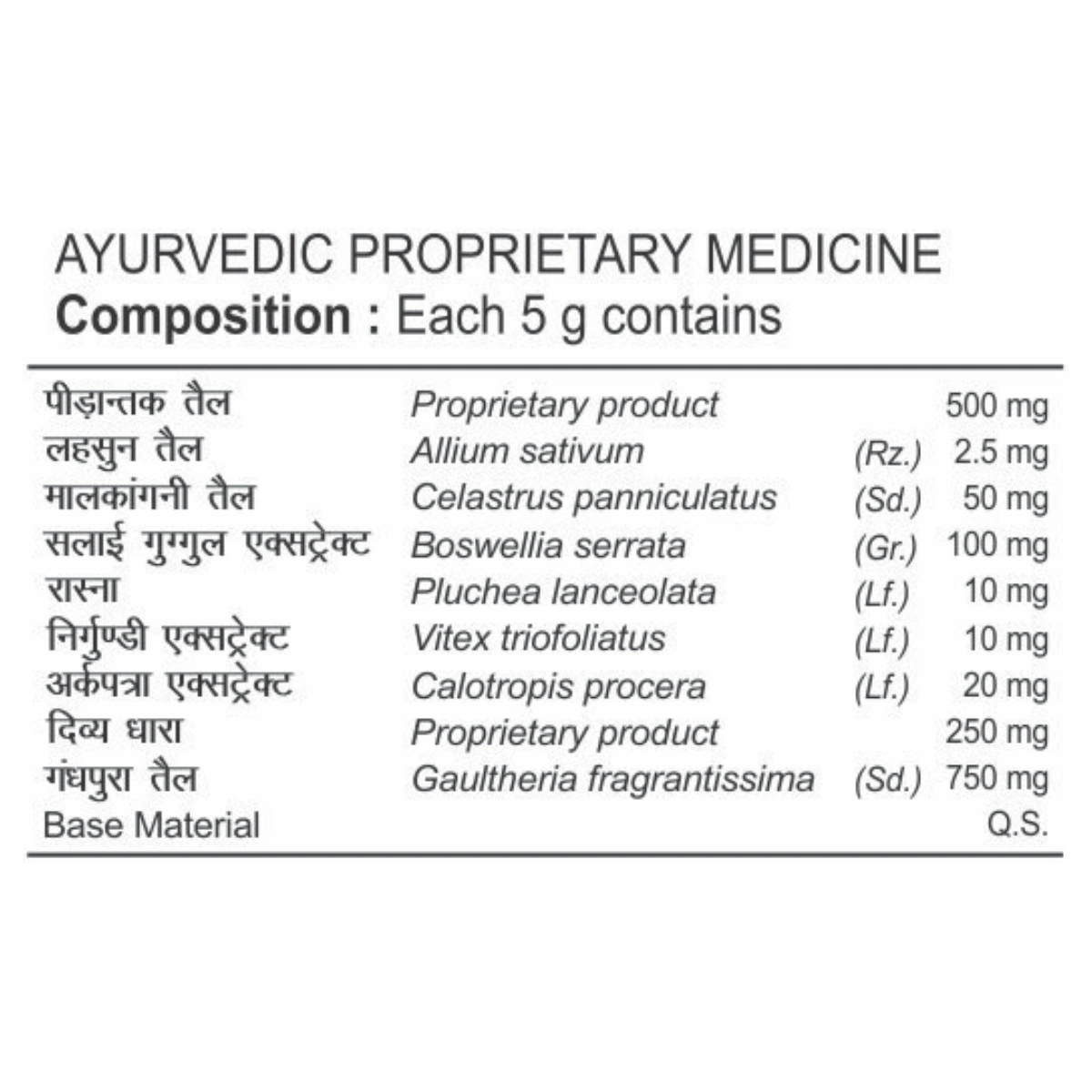 Packed with natural ingredients such as Garlic Oil, Malkangani Oil, Salai Guggul Extract, Rasna, Nirgundi Extract, Ark Patra Extract, and Gandhpura Oil, it effectively eases muscle and joint pain while reducing inflammation levels that contribute to joint and knee pain.