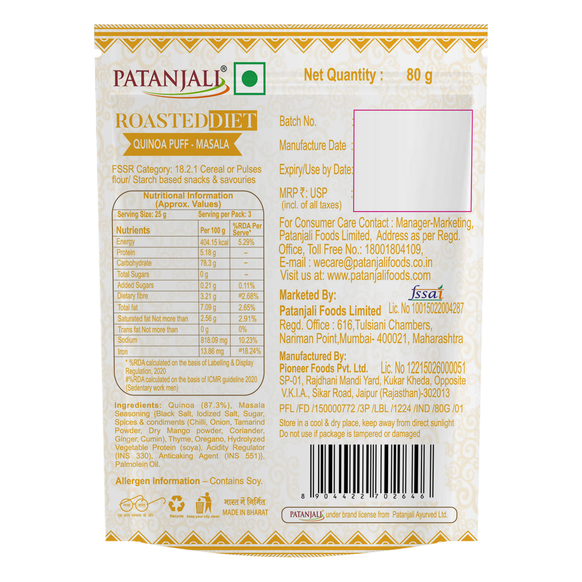 Patanjali roasted diet quinoa masala flavour snack is high in protein, nutritious snack made from the mother of all grains I.E. "Quinoa" which contains all essential nine amino acids and its gluten free.