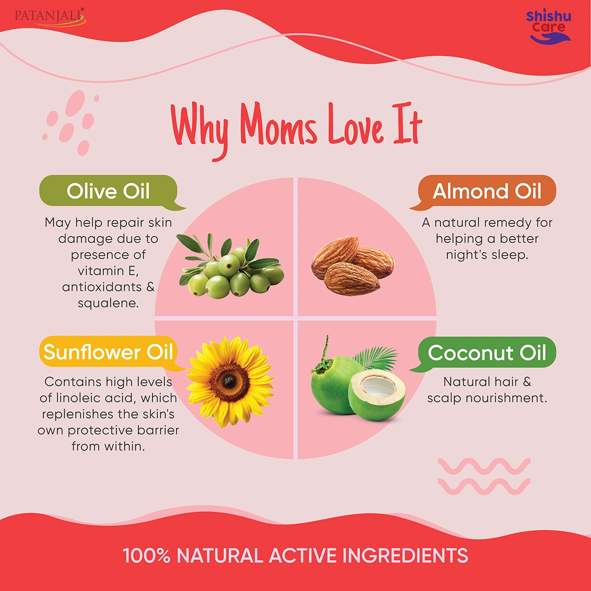 A special light oil, formulated for natural nourishment and gentle care of baby's delicate hair & scalp with Olive oil as a base; enriched with 100% Natural actives; Vitamin E, Almond Oil, Sunower Oil, Mustard Oil & Coconut Oil that helps to nourish the Scalp, reduce dryness & promotes hair growth.