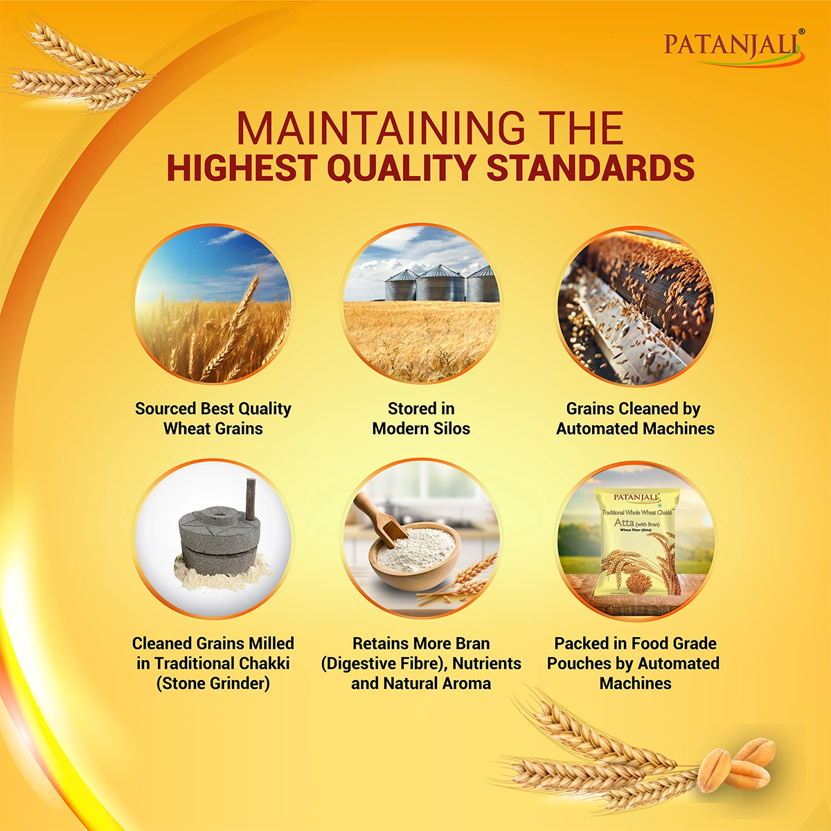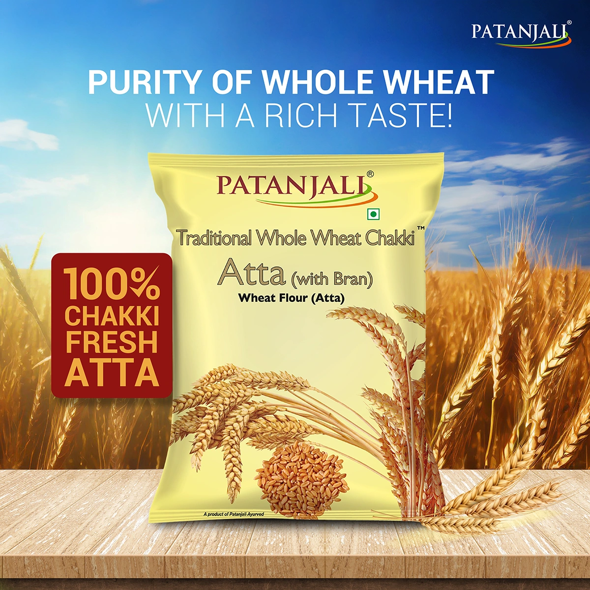Wheat is probably the most common cereal available all over the world. Patanjali whole wheat atta is prepared by high quality of whole wheat (Triticum aestivum), which is passed through different testing such as moisture, hectoliter.