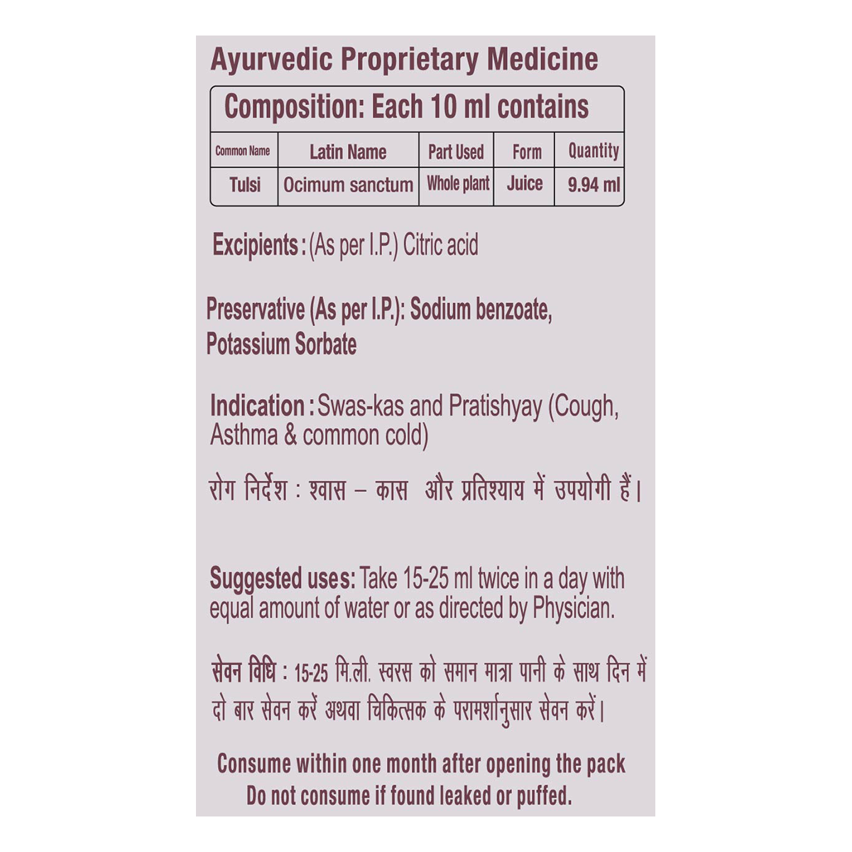 Patanjali Tulsi Panchang juice is a proprietary ayurvedic medicine, crafted from the goodness of Tulsi (Ocimum sanctum). Known for its powerful medicinal properties, this herbal juice supports overall well-being by boosting immunity and managing infections. It is beneficial for respiratory health, heart function, skin vitality, oral hygiene, and digestive balance. Additionally, it helps reduce stress, making it a holistic solution for maintaining a healthy lifestyle.