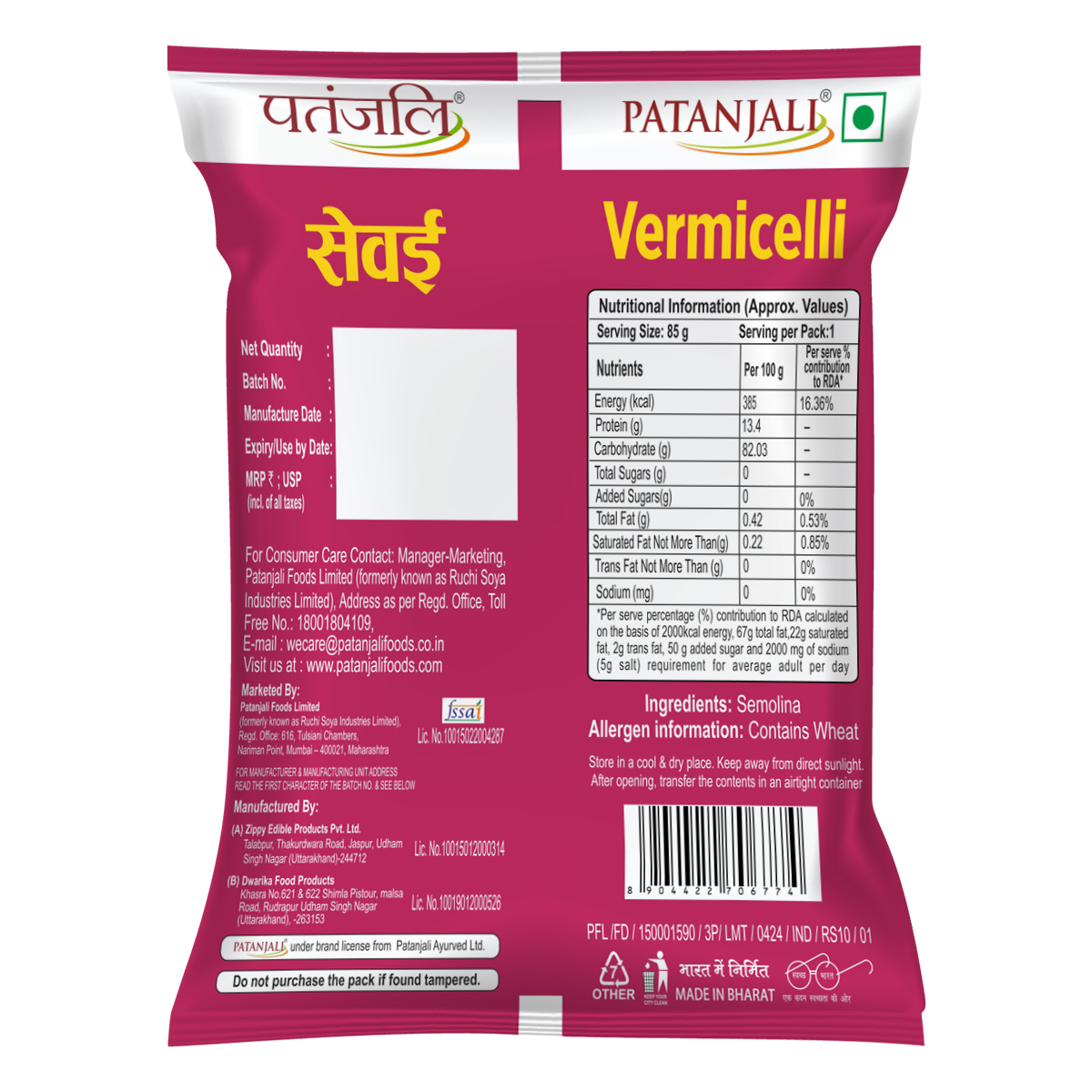 Vermicelli is a kind of pasta in the form of long, thin, solid threads. Vermicelli is a popular dish that serves as a satisfying option for both breakfast and dinner. Patanjali vermicelli is a premium-quality vermicelli made from sooji (semolina).