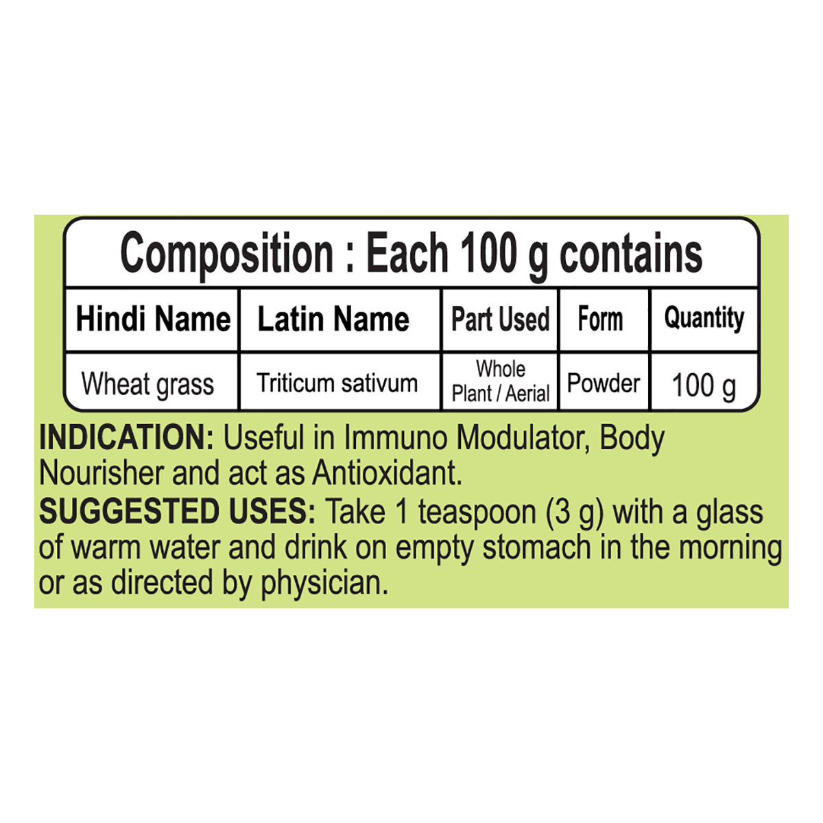 Wheatgrass is green colour fine powder. It shall be free from mustiness, mould, living, and dead insccts fragments, rodent, contamination added colours. It shall free from objectionable smell.
