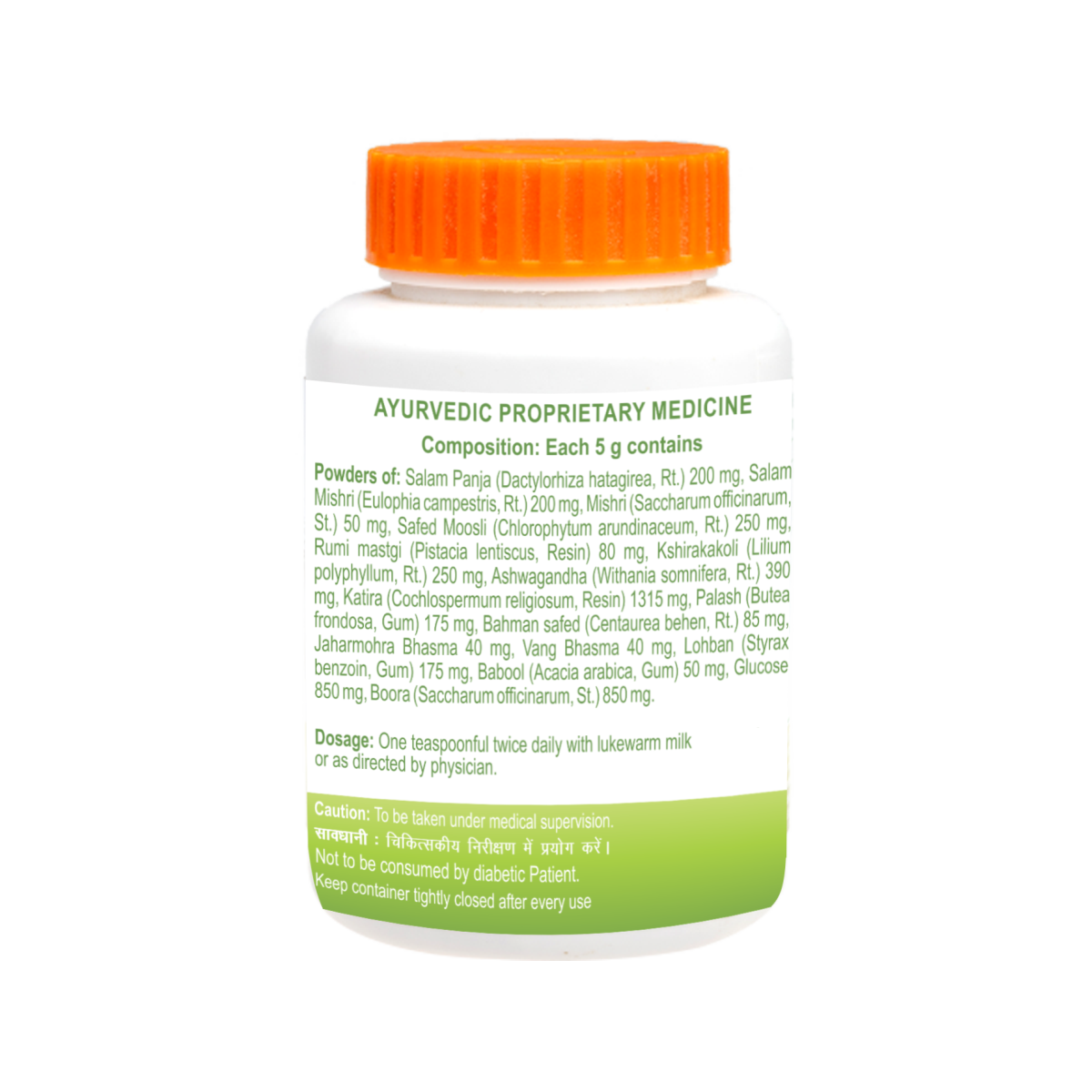 Off-white to light brown colour granular powder with characteristic odour and taste. Salam panja, Salam mishri, Mishri Safed moosli ,Kshira, kakoli , Ashwagandha, Gond katira, Palasha ,Bahman ,safed Jaharmohra bhasma, LohbanBabool , gond GlucoseBoora To be taken under medical supervision. One teaspoonful twice daily after meal with lukewarm milk or as directed by physician.