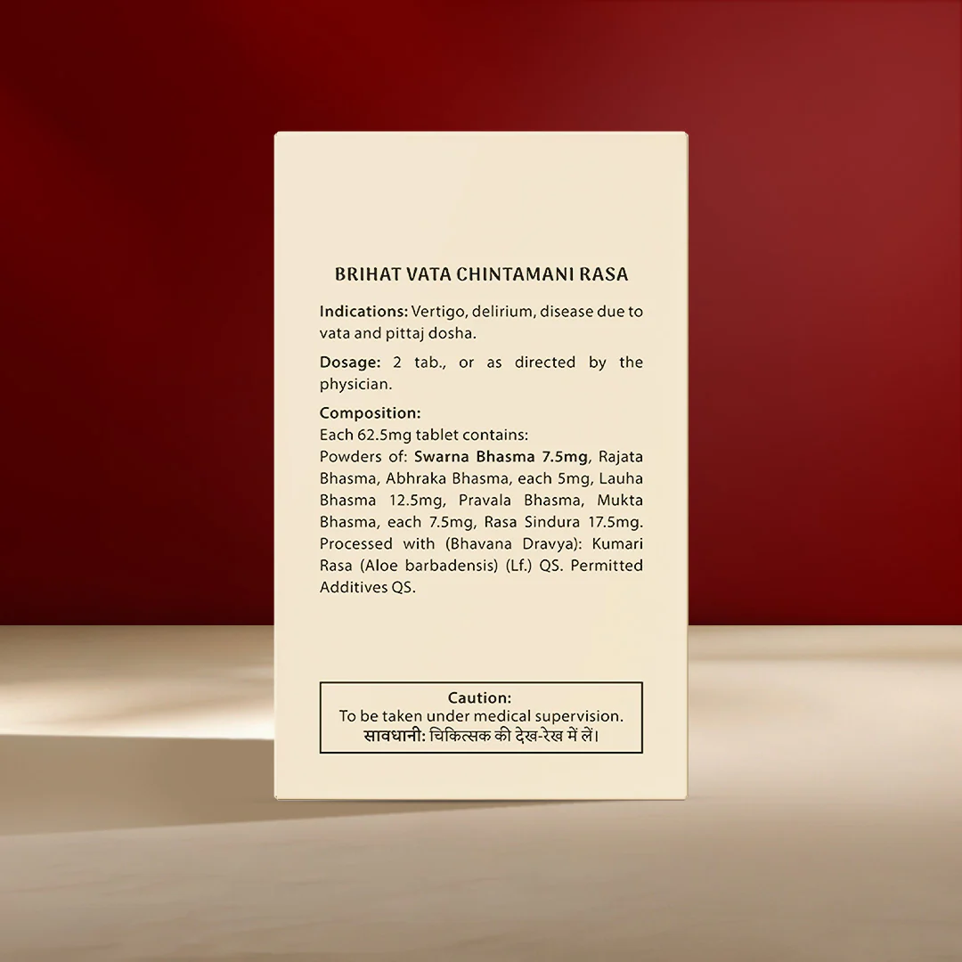 Brihat Vata Chintamani Rasa used to treat diseases caused by Vata dosha imbalance such as paralysis, hemiplegia, facial palsy, tremors, etc. It is a compound mineral preparation, known for its cellular regenerative properties and hence useful in the management of neuro-illnesses as well.