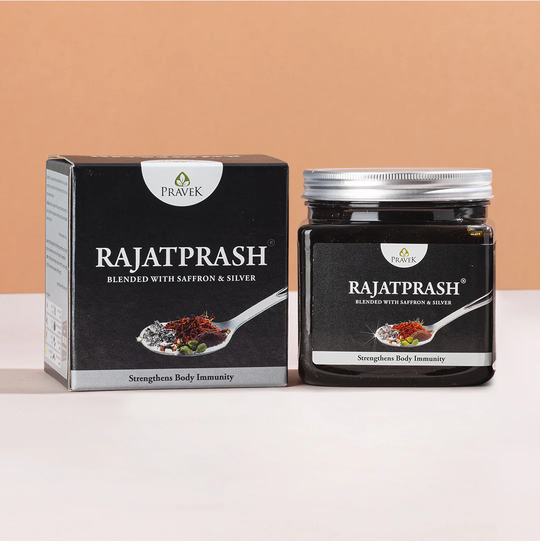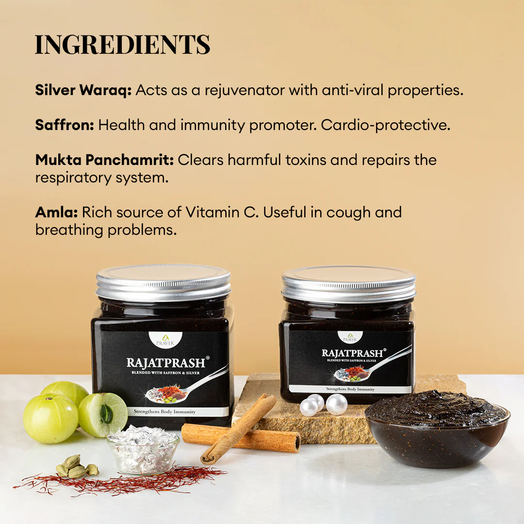 Rajatprash is a premium Ayurvedic blend, specially crafted for those who seek a healthy and disease-free life. It elevates the traditional Chyawanprash with the enhanced benefits of Vegetarian Silver Waraq, Pure Saffron, Mukta Panchamrit, and Unadulterated Honey, along with 53 other powerful ingredients. Its unique formulation revitalizes the body, boosts immunity, and keeps one energized in today’s fast-paced world. Rajatprash or Chandi Wala Chyawanprash is a safe ayurvedic remedy to lead a well-balanced life.