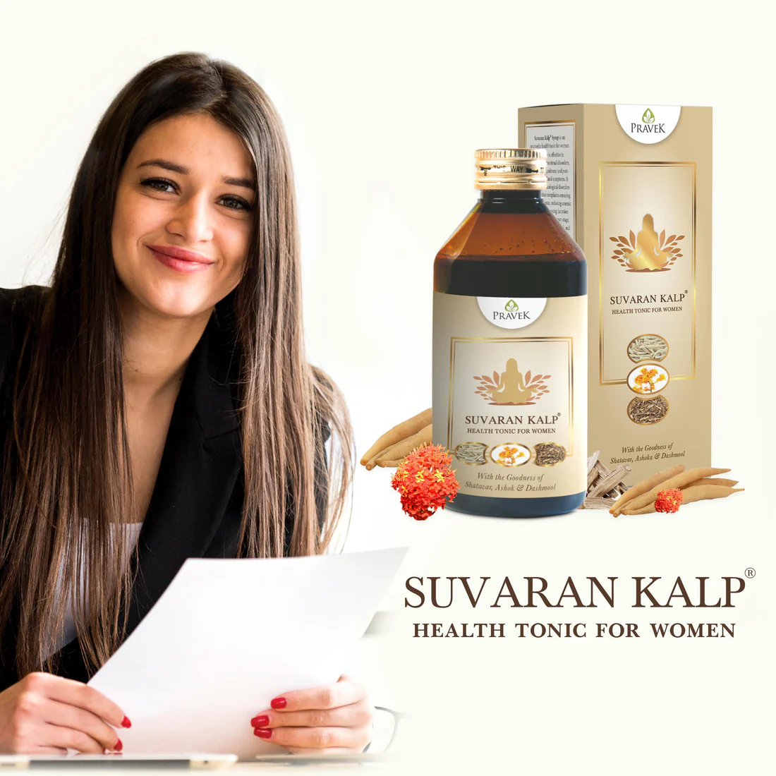 Suvaran Kalp Syrup maintains the reproductive health of a woman. It helps to manage gynaecological conditions like menstrual irregularities, PMS (pre menstrual syndrome) and hormonal imbalance. It also provides relief in certain conditions like hot flushes, menstrual cramps and stress. It helps maintain overall health and vitality of a female.