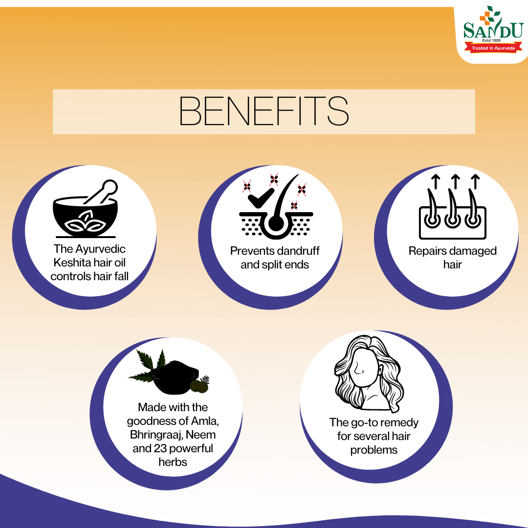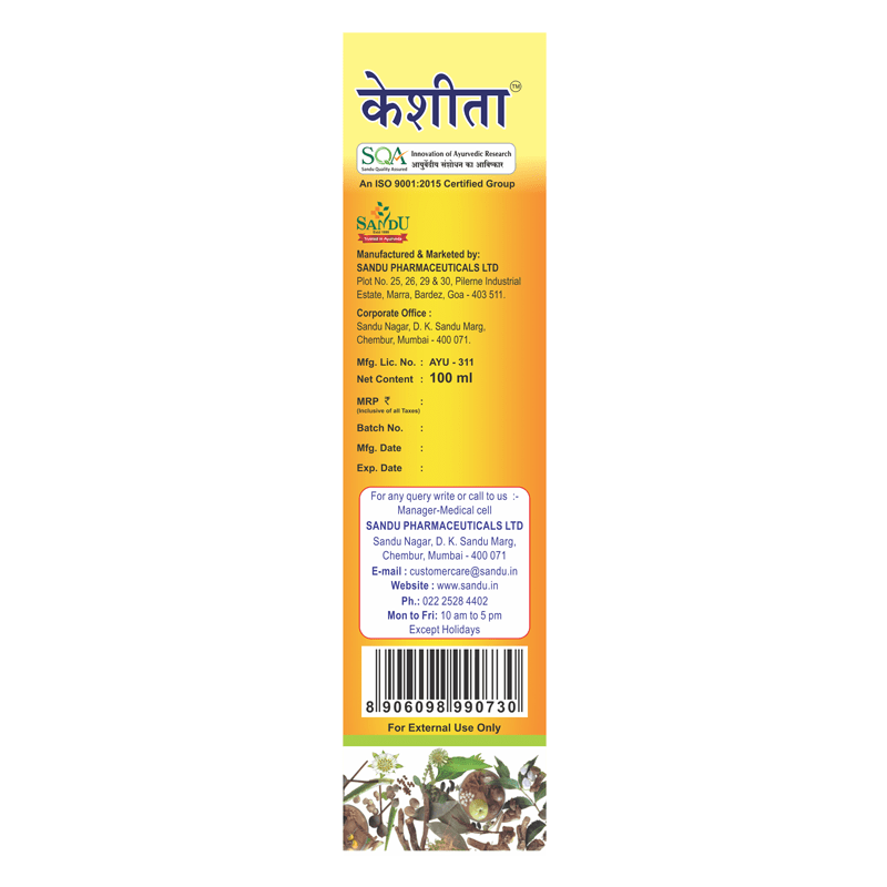 Keshita (Sandu Mahabhringaraj oil) strengthens hair follicles and strands, arrests thinning of hair, confers long and silky hair