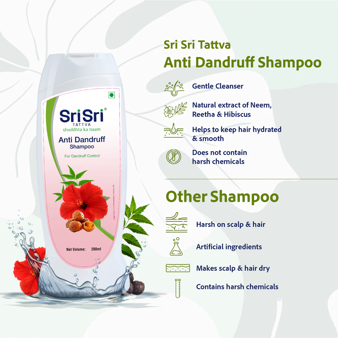 Sri Sri Tattva Anti Dandruff Shampoo is an Ayurvedic hair care product formulated with natural extracts to control dandruff and soothe itchy scalps while maintaining hair health. It is typically available in a 200 ml size for approximately ₹113 to ₹150 depending on the retailer. Main Ingredients: Contains Neem, Hibiscus, and Reetha (Soapnut). Neem provides antifungal properties, Reetha acts as a natural cleanser, and Hibiscus conditions the hair. Primary Benefits: It is clinically proven to reduce dandruff, alleviate scalp itching, and cleanse each strand from root to tip. Hair Type: Suitable for all hair types. Usage Instructions: Apply to wet scalp and hair, massage to form a lather, and rinse thoroughly. For best results, use twice or thrice a week.