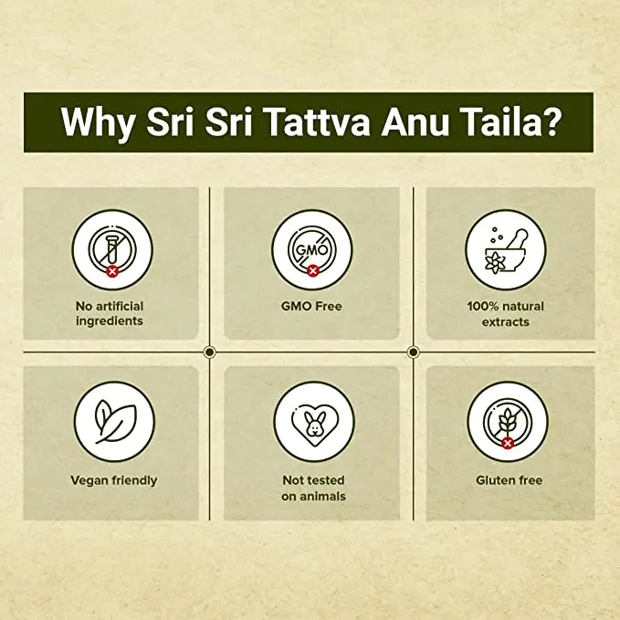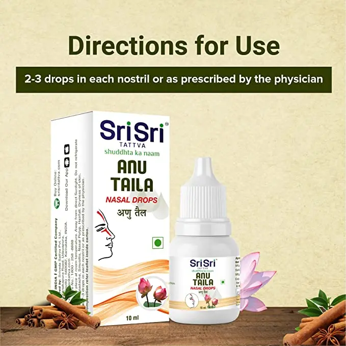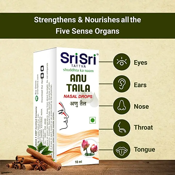 Sri Sri Tattva Anu Taila is an Ayurvedic nasal oil (Nasya) used to nourish and strengthen the five sense organs, relieve sinus congestion, and support respiratory health. It is traditionally used to treat headaches, migraines, allergic rhinitis, and hair-related issues such as premature greying and hair fall. BigBasket BigBasket Key Benefits & Ingredients Five Sense Organ Support: Designed to nourish and strengthen the ears, eyes, nose, tongue, and throat to enhance sensory perception. Respiratory & Sinus Relief: Effective in managing sinusitis, nasal polyps, and allergic rhinitis by reducing mucosal edema. Neurological Health: Strengthens nerves and is used as an adjunct in treating facial paralysis (Ardita) and reducing migraine frequency. Hair & Scalp Care: Helps prevent premature greying, reduces hair fall, and addresses scalp dryness. Tridosha Balance: Formulated to balance Vata, Pitta, and Kapha doshas, which helps in maintaining overall hormonal health in the head and neck region. Ingredients: According to 1mg, key herbal components include Jivanti, Devadaru, Jalada, Twak, Sevya (Ushira), Gopi (Sariva), and Hima (Shweta Chandana).