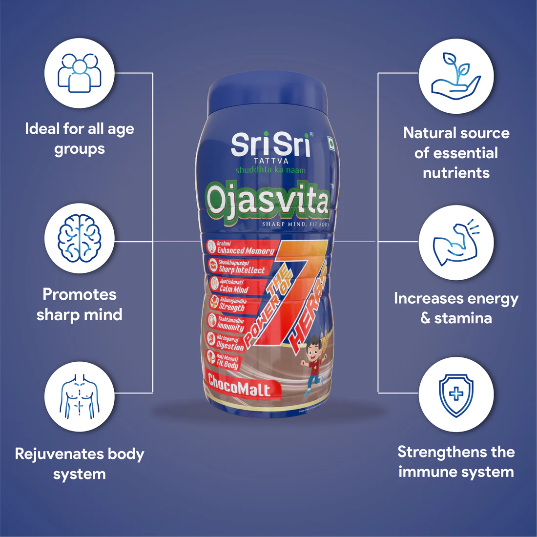 Sri Sri Tattva Chocolate Ojasvita is an Ayurvedic health drink mix designed to support cognitive function and physical vitality. Formulated with a blend of seven traditional herbs, it is marketed as a healthier alternative to sugary beverages for both children and adults. Sri Sri Tattva Sri Sri Tattva Key Benefits Cognitive Support: Contains Brahmi and Shankhapushpi, herbs traditionally used in Ayurveda to enhance memory, concentration, and mental clarity. Immunity and Energy: Designed to build body resistance and provide instant energy and stamina through ingredients like Ashwagandha and Shatavari. Digestion and Metabolism: Herbs such as Jyotishmati help improve digestive strength and metabolic rate. Nourishment: Provides essential minerals like Potassium, Zinc, and Iron to support overall growth and body rejuvenation.