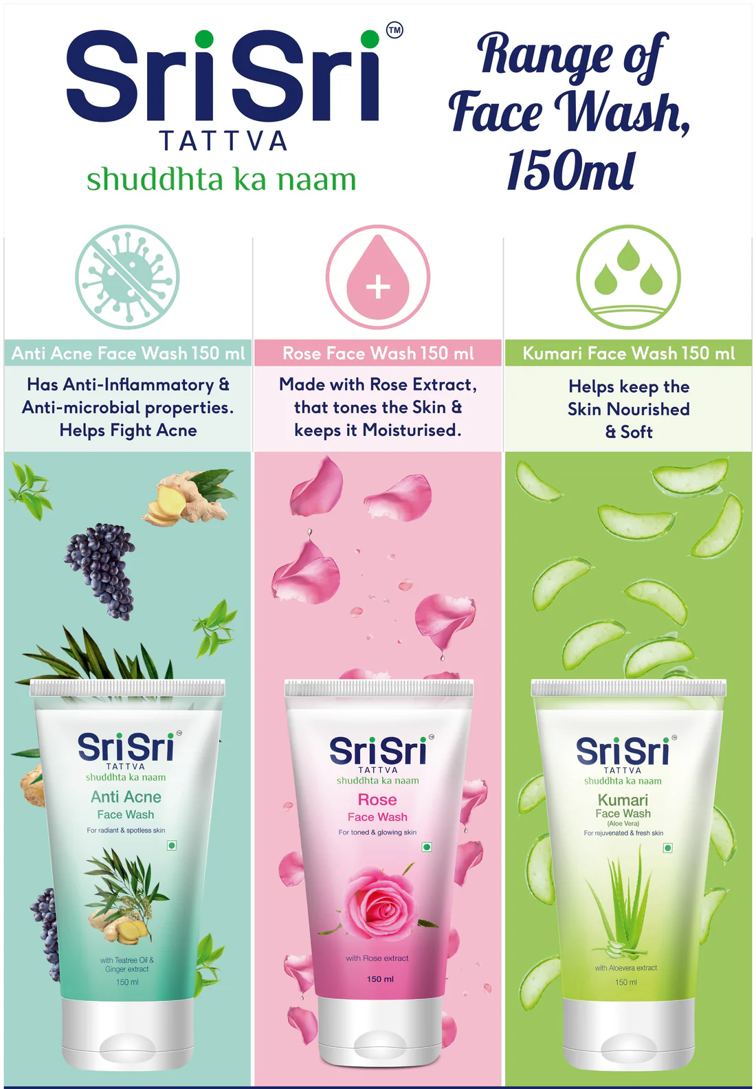 The Sri Sri Tattva Face Wash Trio is a curated skincare combo designed to keep the skin soft, fresh, and well-nourished using Ayurvedic formulations. This set typically includes three 150ml bottles: Rose Face Wash, Anti Acne Face Wash, and Kumari Face Wash.
