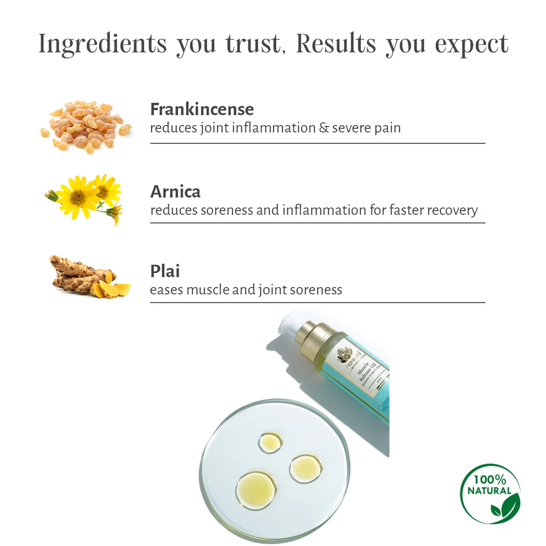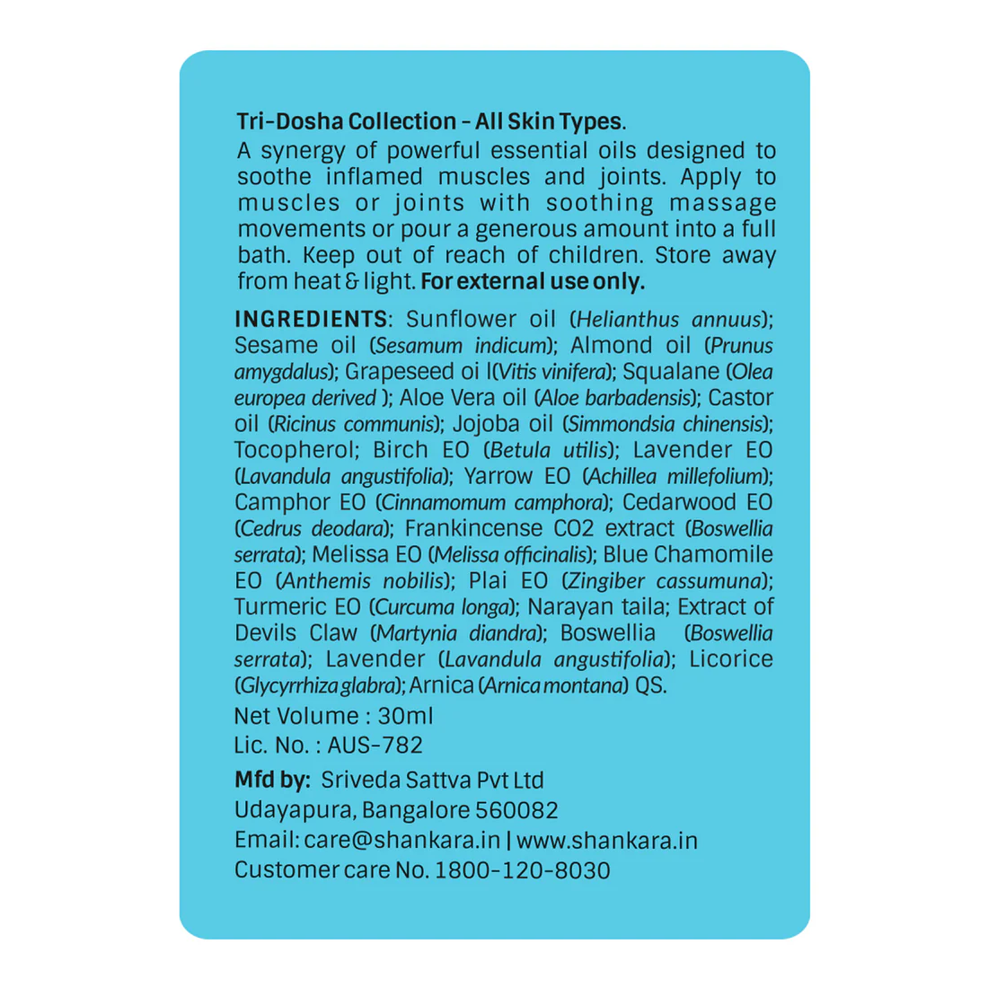 Frankincense: Known for its comforting and calming properties, often used to treat joint pains. Helichrysum: Rejuvenates the skin while helping to alleviate tension and pain. Plai (Ginger Family): Renowned for easing soreness related to chronic conditions like Arthritis. Botanical Extracts: Includes Arnica, Boswellia, Devil’s Claw, and Licorice for their anti-inflammatory properties. Carrier Oils: A base of Sunflower, Almond, Sesame, Jojoba, and Castor oils to nourish the skin. Sri Sri Tattva Sri Sri Tattva Usage Instructions Direct Application: Apply liberally onto sore muscles and joints. Massage: Gently massage the oil into the skin until fully absorbed. For best results, allow it to absorb for approximately 10 minutes. Warming: The oil can be warmed before use for a more relaxing full-body massage experience. Versatility: It can also be added to a warm bath or used as a body moisturizer.