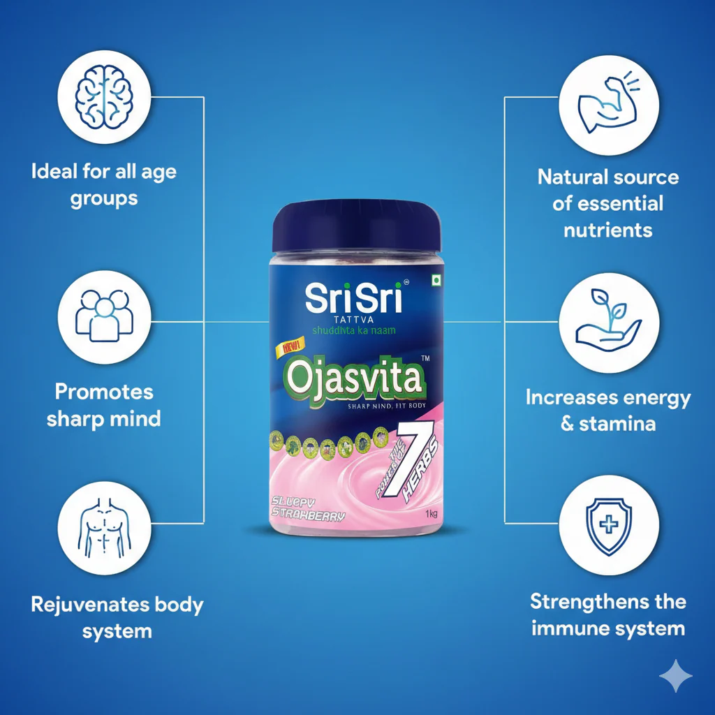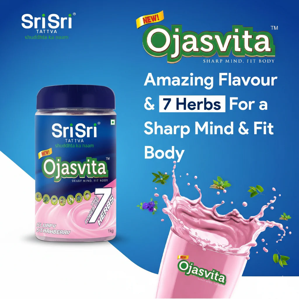 Sri Sri Tattva Strawberry Ojasvita is an Ayurvedic health drink designed to support mental fitness and physical stamina using a blend of seven traditional "Power Herbs". It is widely used as a nutritional milk mix for both children and adults due to its ability to mask herbal tastes with a sweet, creamy strawberry flavor. Sri Sri Tattva Sri Sri Tattva +4 Key Benefits and Ingredients The drink is formulated to provide comprehensive daily nutrition and wellness support: 7 Power Herbs: Contains Ashwagandha, Brahmi, Bringaraj, Jyotismath, Kali Musali, Satavari, and Shankapushpi. Mental Fitness: Formulated to enhance memory, focus, and concentration. Physical Health: Aims to build immunity, increase energy, and provide nourishment and strength to the body. Usage: Recommended dosage is 1–2 teaspoons mixed in a glass of hot or cold milk, consumed twice daily (morning and evening).