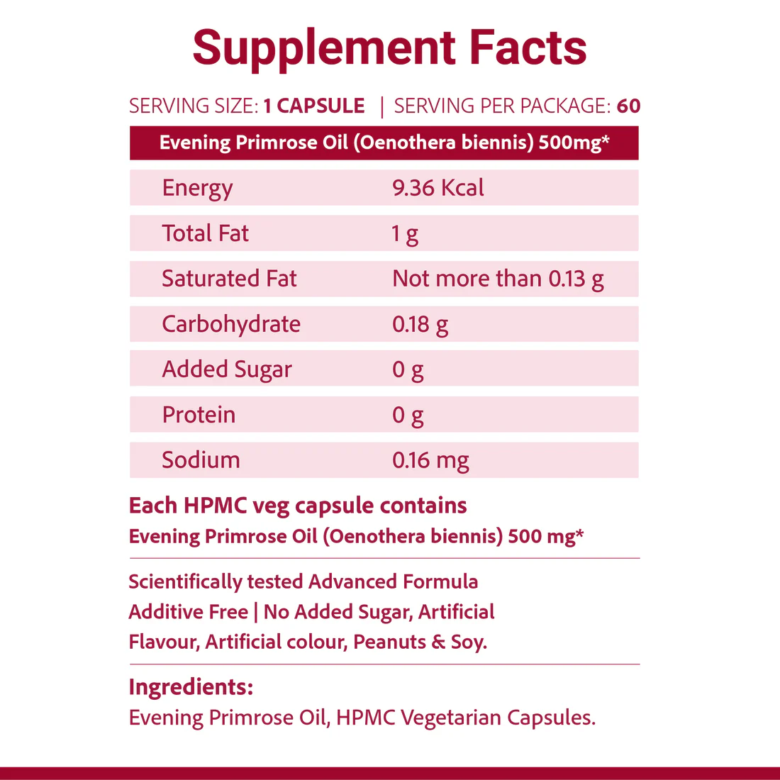 According to manufacturer details on Sri Sri Tattva and Amazon.in: Dosage: Each capsule contains 500 mg of Evening Primrose Oil. Quantity: 60 vegetarian capsules per bottle. Form: Encapsulated in Hydroxypropyl Methylcellulose, making them 100% vegetarian and non-GMO. Nutrient Profile: Each serving provides approximately 9.36 calories and 1g of total fat.