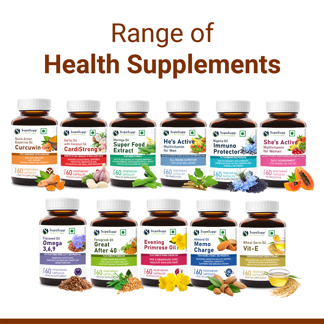 Sri Sri Tattva SupaSupp Evening Primrose Oil is a vegetarian health supplement formulated to support women's hormonal balance and skin health through Gamma-Linolenic Acid (GLA). Truemeds Truemeds +1 Key Benefits PMS Relief: Contains GLA, which helps regulate prostaglandins to alleviate symptoms like abdominal bloating, irritability, and breast tenderness. Menopause Support: Traditionally used to reduce the frequency and severity of hot flashes and other vasomotor symptoms. Skin & Hair Health: Promotes skin elasticity and moisture retention while containing arachidonic acid, which is shown to support new hair growth. Anti-Inflammatory: Helps reduce joint stiffness and inflammation, potentially benefiting those with mild joint discomfort.