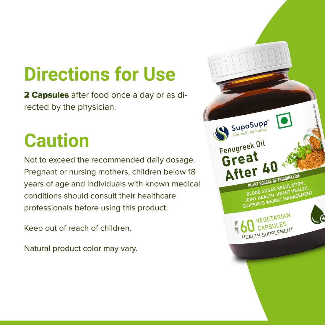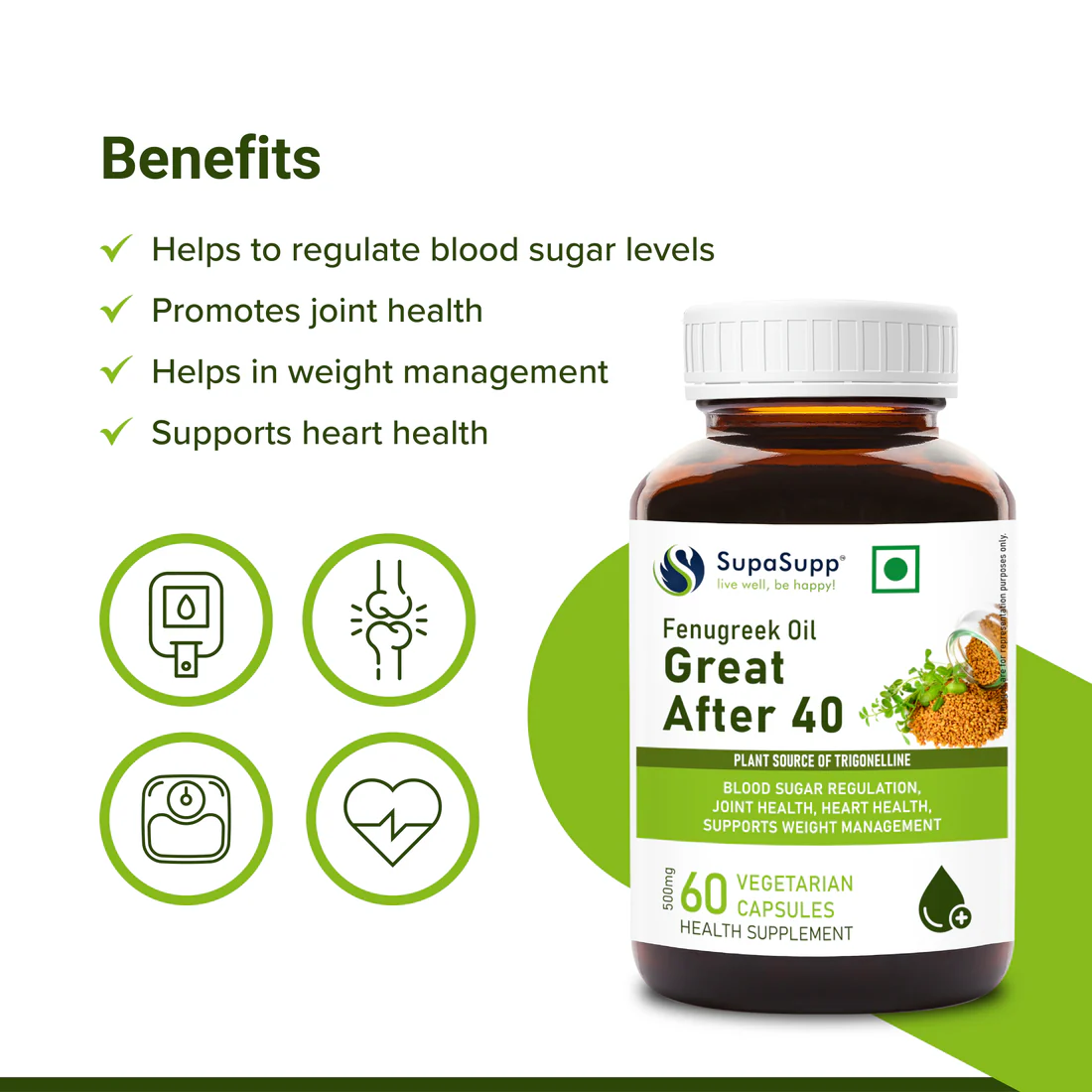 Sri Sri Tattva SupaSupp Fenugreek Oil Great After 40 is a premium health supplement specifically formulated to support individuals over 40 in managing blood sugar, joint health, and cardiovascular well-being. Each pack contains 60 vegetarian capsules, with each capsule providing 500 mg of high-quality fenugreek oil. Truemeds Truemeds +1 Key Benefits and Usage Blood Sugar Regulation: This supplement is primarily used to help maintain healthy glucose levels by slowing down the digestion and absorption of carbohydrates. Joint and Heart Health: According to TrueMeds, the anti-inflammatory properties of fenugreek oil support joint flexibility and comfort. It also promotes cardiovascular health by helping to manage cholesterol and blood pressure levels. Weight and Digestive Support: The fiber content in fenugreek may promote a feeling of fullness, aiding in calorie control and weight management. It also helps improve gut health and reduce inflammation. Recommended Dosage: The manufacturer suggests taking two capsules daily after food, or as directed by a healthcare professional.